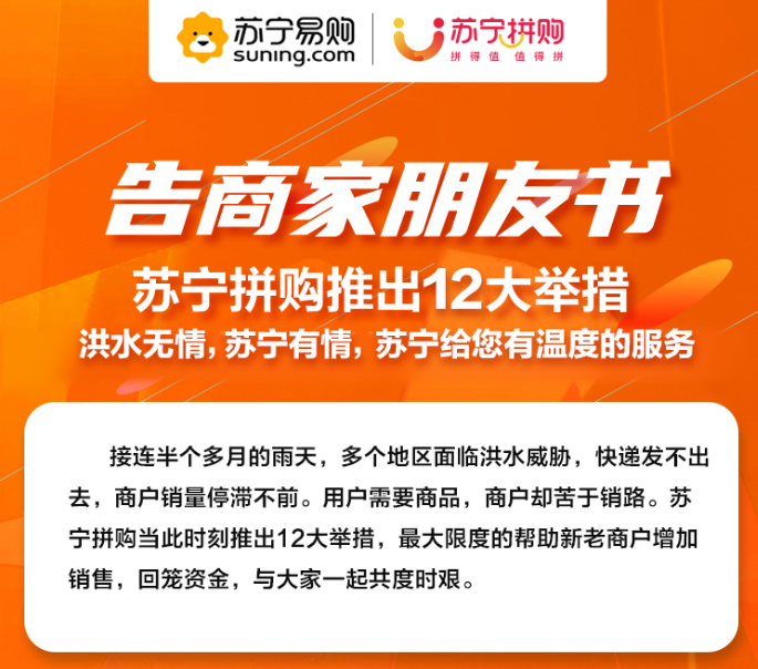 為了更好的幫助全國(guó)受汛情影響的農(nóng)民搶銷(xiāo)農(nóng)產(chǎn)品,蘇寧拼購(gòu)發(fā)布了“戰(zhàn)汛十二條”的具體舉措,分為四大扶助方向: