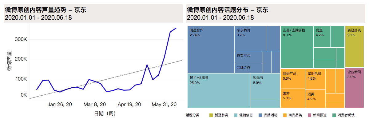 6月與疫情相關(guān)的話題內(nèi)容已降至全部話題的3%,表明用戶對疫情的關(guān)心已逐漸轉(zhuǎn)回到京東平臺核心功能上,即平臺的電商本質(zhì)。在用戶體驗方面的反饋中,提及“京東值得信賴”的內(nèi)容占比近45%。京東在疫情爆發(fā)期間包括物資捐贈,醫(yī)療物資運(yùn)輸?shù)仍趦?nèi)的舉措使京東得到了社交媒體用戶的肯定與贊揚(yáng)。在618購物節(jié)開始后,用戶對京東平臺的討論也更多集中在“平臺大”、“信得過”等方面。