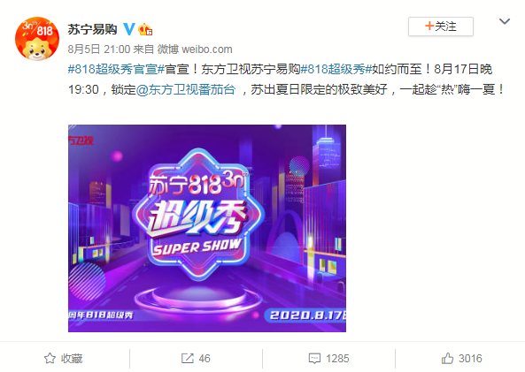 這是繼618打造全國首檔綜藝電商融合直播超級秀后,雙方再次聯(lián)手,繼續(xù)重磅推出綜藝電商融合直播的IP—“超級秀”。也是繼與抖音、微博達(dá)成了戰(zhàn)略合作之后,蘇寧易購官方發(fā)布的又一則重磅消息。