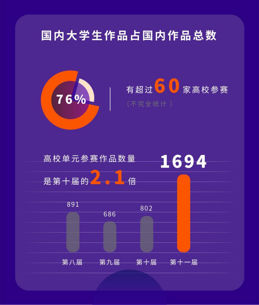 作為參與金鵬短片導(dǎo)演扶持計(jì)劃的重要力量,今年高校大學(xué)生的參賽積極性持續(xù)高漲。本屆短片節(jié)發(fā)起的“全國大學(xué)生視頻創(chuàng)意大賽”共收到來自全國超過60所高校的1694部參賽作品,數(shù)量同比增長一倍。國內(nèi)大學(xué)生參賽作品數(shù)量在所有國內(nèi)參賽作品總數(shù)中占比58%,大學(xué)生創(chuàng)作者一躍成為金鵬短片導(dǎo)演扶持計(jì)劃的中堅(jiān)力量,凸顯了新時(shí)代下年輕創(chuàng)作者對短片以及短視頻的無限熱情和興趣執(zhí)著。大學(xué)生競賽單元將分別評選出“最佳大學(xué)生短片”、“最佳大學(xué)生劇情短片”、“最佳大學(xué)生紀(jì)錄短片”、“最佳大學(xué)生動畫短片”、“最佳大學(xué)生VLOG短片”、“最佳大學(xué)生科普短片”、“最佳大學(xué)生廣告創(chuàng)意短片”、“最佳大學(xué)生原創(chuàng)音樂短片”等9大類型入圍優(yōu)秀作品。