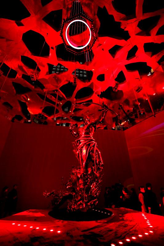 大型沉浸式藝術裝置“赤子心”橫跨了平安金融中心商場九至十層平臺,總占地面積近四千平方米。在展出十五件大型雕塑作品的同時,將光影藝術與聲音藝術巧妙融合,串聯(lián)起虛擬影像與現(xiàn)實空間,以闡釋純粹、無畏的赤子之心?!俺嘧有摹笔褂^眾走入藝術品內(nèi)部、探索藝術家的內(nèi)心深處,通過親身參與展覽并與之對話,從而理解“其大無外,其小無內(nèi),世界即內(nèi)心投射”的本質(zhì)。