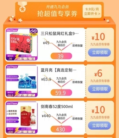活動期間,九九會員可搶專享大額券,大牌網(wǎng)紅爆品狂歡底價(jià)。三只松鼠網(wǎng)紅堅(jiān)果禮盒998g*2券后價(jià)39元,藍(lán)月亮洗衣液禮包券后價(jià)59.9元,劍南春52度500ml酒券后價(jià)430元......實(shí)實(shí)在在讓用戶買到“真低價(jià)”,買的“真值得”!