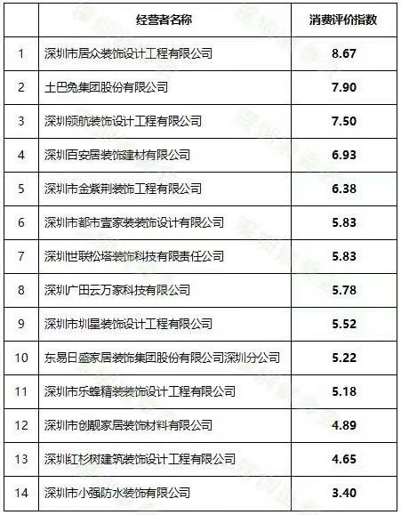 深圳市消委會數(shù)據(jù)顯示,在對2020年4月1日至2021年3月31日期間深圳注冊并有一定市場占有率的14家裝飾裝修經營者進行消費評價指數(shù)排名后發(fā)現(xiàn),14家經營者均已建立投訴處理和解通道,消費評價指數(shù)平均值為5.98分,大部分企業(yè)能快速響應消費者投訴且處理成功率較高,體現(xiàn)了經營者對消費者的重視程度較高,降低了消費者的維權成本。
