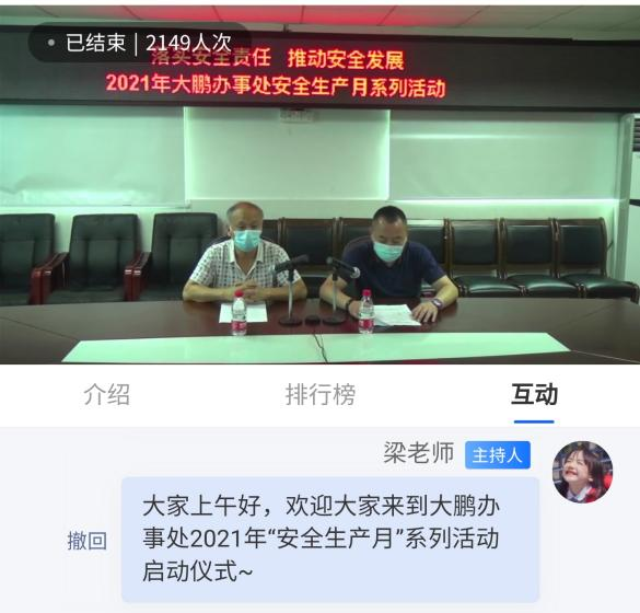 近日,大鵬辦事處組織開展了安全生產(chǎn)月系列活動(dòng),因疫情防控需要,此次啟動(dòng)儀式采取線上直播的方式進(jìn)行,轄區(qū)2100余名居民熱情參與“走進(jìn)”會(huì)議現(xiàn)場(chǎng),參與答題人數(shù)1750人,活動(dòng)共計(jì)派發(fā)紅包635份。