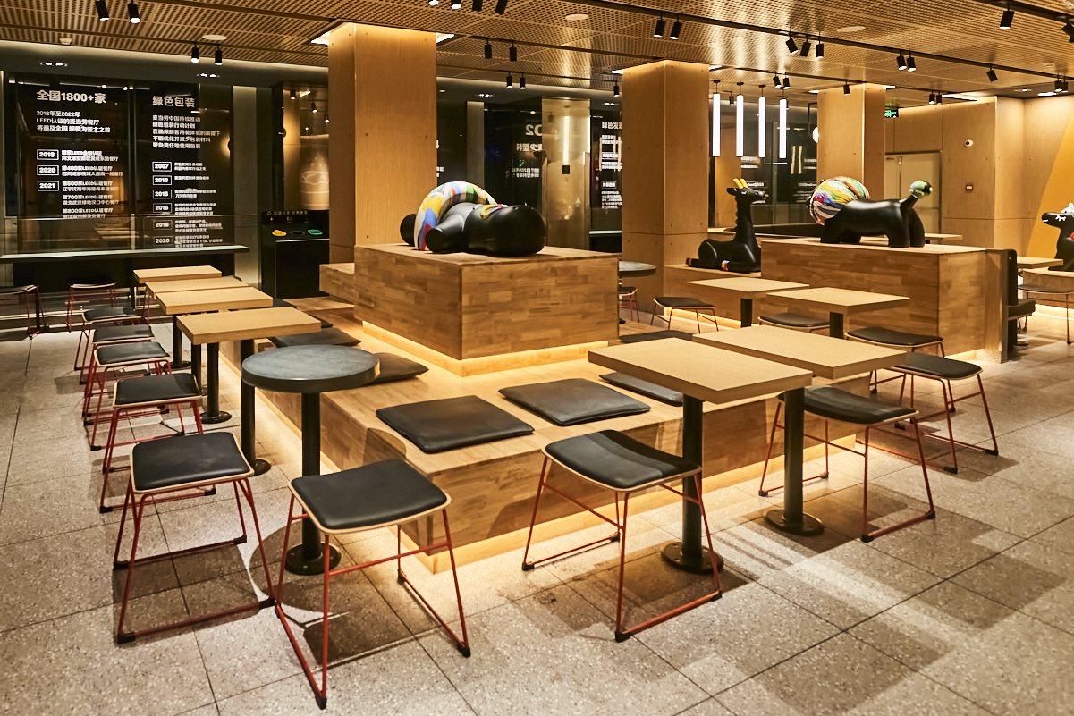 據(jù)了解,在這家餐廳中,麥當勞中國也探索了更多綠色創(chuàng)新的新應用,包括首次使用更節(jié)能舒適的照明系統(tǒng);首次使用回收再造家具,100%海洋塑料回收制成的餐廳座椅;可回收的室內裝飾等。
