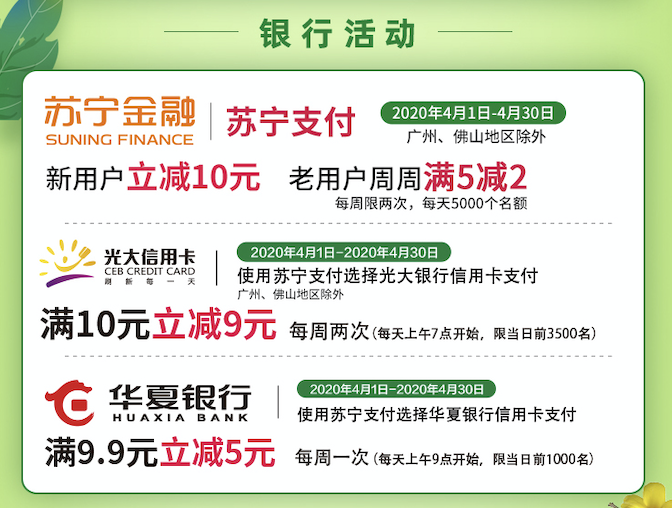 隨著蘇寧418大促開啟,蘇寧小店福利再升級(jí),用蘇寧支付新老用戶可享支付立減,還有第二件半價(jià)、每周滿減、新人券包以及華夏、光大銀行信用卡滿減等優(yōu)惠等著你。