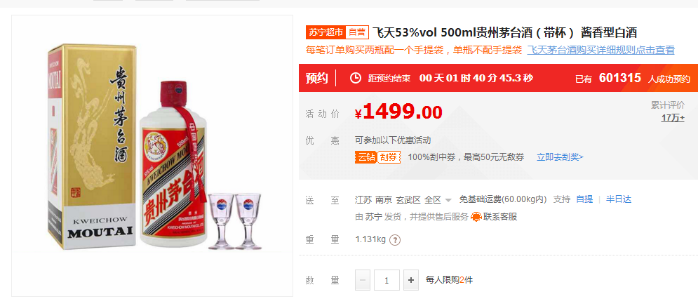 1499元飛天茅臺酒1月16日蘇寧開搶 春節(jié)前倒數(shù)第二波