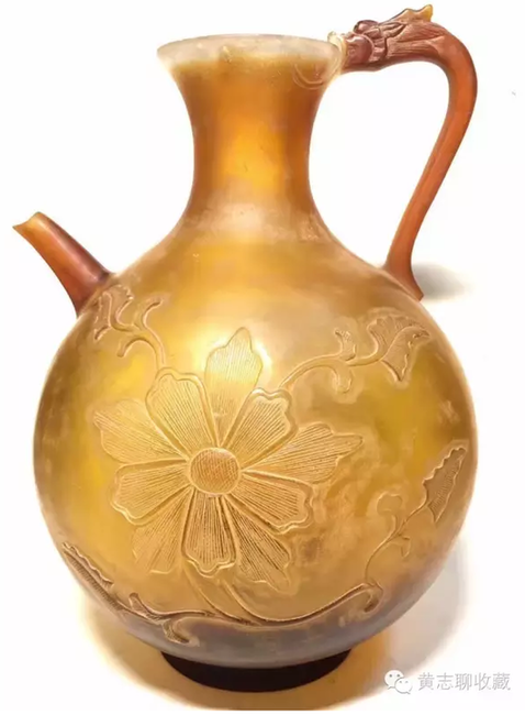 琉璃在唐代極為名貴。這從史書記載可窺一二。房玄齡的《晉書》中有關(guān)于琉璃器的記載“(王濟)性豪侈,麗服玉食……帝嘗幸其宅,供饌甚豐,悉貯琉璃器中?!蓖鯘谡写实蹠r用了成套的琉璃碗盤,以逞其豪富,可見當(dāng)時琉璃器之貴重或要超過金、銀等器。又如宋代司馬光主編的《資治通鑒》中記載了這樣一段歷史事實:嶺南節(jié)度使路嗣恭在平息叛亂中趁機劫掠商民,得到了大批財物。他把其中一個直徑九寸的琉璃盤獻給了唐代宗。唐代宗非常高興,“以為至寶”。法門寺地宮出土的唐代琉璃器大多為皇家捐贈的禮佛之物也可佐證其珍貴。 這件執(zhí)壺為琉璃材質(zhì),高20cm、腹徑14.5cm,色澤黃褐,半透明,晶瑩潤澤,光澤柔和。小口,束頸,腹部圓鼓,餅足;前有直流,后為龍柄。整體形制穩(wěn)重大方,圓潤飽滿,具有典型的唐代特征。壺身兩面刻有菊紋,線條流暢自然,勁健有力。整體透入出唐人的灑脫自信。這類唐代的琉璃作品存世極少,目前為數(shù)不多的一些作品大多出自窖藏、地宮及貴族墓葬,屬于珍稀文物。此件執(zhí)壺保存完整,尤為難得。 欣賞更多藏品,歡迎瀏覽【黃志博物館】網(wǎng)站:www.huangzhimuseum.com?