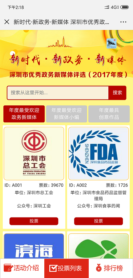 ② 多個投票活動已經形成良好群眾效應,合作方主辦方多屆舉辦,每屆舉辦均由深圳新聞網(wǎng)負責投票系統(tǒng)開發(fā),例如:健康場所投票、集團攝影大賽評選投票、政務類投票。形成了良好品牌效應和示范,往往一個區(qū)舉辦的投票活動其他區(qū)會跟進舉辦,形成系列投票,例如:“最美護士”系列投票,“最美醫(yī)生”系列投票,“最美教師”系列投票,“最佳政務”系列投票等;