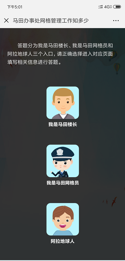 隨著當前光明新區(qū)經(jīng)濟和社會的飛速發(fā)展,網(wǎng)格巡查管理工作環(huán)境日趨復(fù)雜。為此,馬田辦事處以社區(qū)網(wǎng)格化為抓手,積極帶領(lǐng)業(yè)主、樓長、住戶主動參與到樓棟的管理和社區(qū)的建設(shè),使他們從小“家”邁向大“家”,家家參與、人人行動,讓安全文明新風(fēng)形成常態(tài),營造生機勃勃、欣欣向榮的社會氛圍,在馬田轄區(qū)打造共建共治共享社會治理格局?!榜R田辦事處網(wǎng)格管理工作知多少”線上有獎競答活動,由光明新區(qū)馬田辦事處主辦,馬田社區(qū)網(wǎng)格管理中心承辦。此次答題活動自8月15日9點啟動,截止至8月19日23點59分,為期5天。答題分為“我是網(wǎng)格員”入口、“我是樓長”入口和“阿拉地球人”三個入口。通過樓長入口進入的用戶,需輸入馬田轄區(qū)樓長身份證或港澳通行證號方可答題,網(wǎng)格員入口則需輸入馬田轄區(qū)網(wǎng)格員有效證件號碼進入對應(yīng)的答題頁面。在每次答題時,答題系統(tǒng)將隨機抽取10道題,用戶須在120秒的時間內(nèi)完成,答對8題以上即視為闖關(guān)成功,可獲得一次抽獎機會,有機會獲得100元、50元、10元、5元、2元不等的微信紅包。