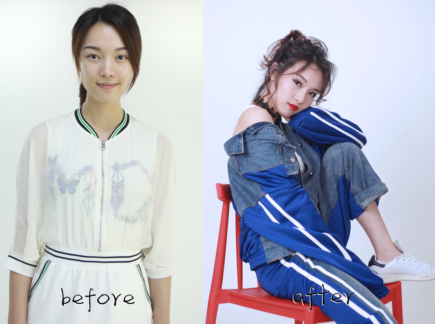 改造前后的芷苑小姐姐。從妝發(fā)上找到了五官和臉型的個性,服裝上選擇了牛仔最擅長的街頭風格。從一個清新的辦公室女孩,變成了時髦街頭酷女孩。