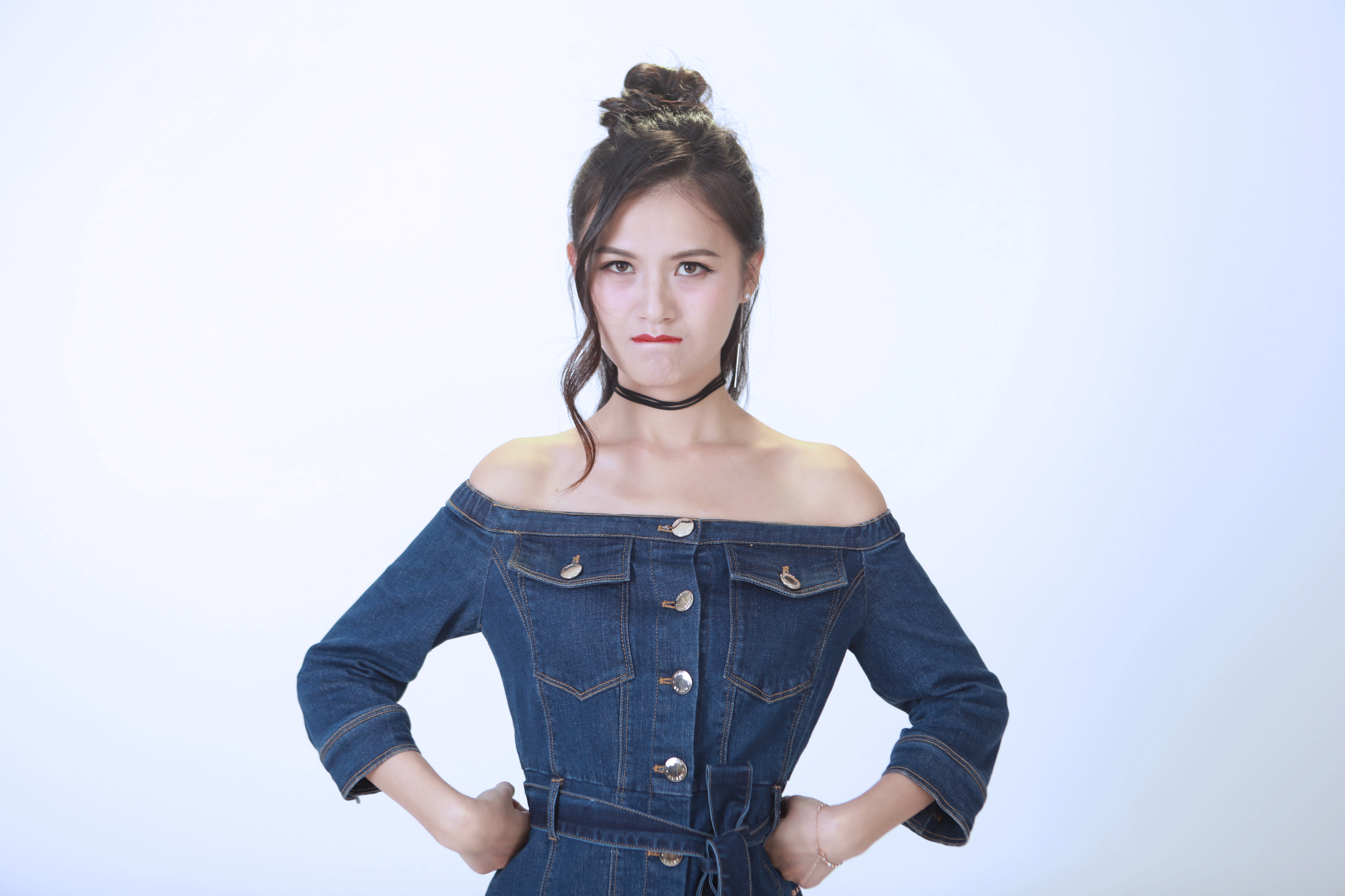 曉敏小仙女第二套造型,一字肩牛仔連體裙 ,露出讓人羨慕哭的鎖骨俏皮又性感。半丸子頭輕松又有女人味。