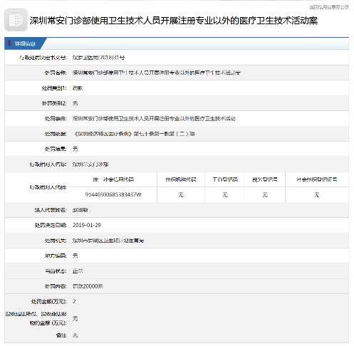 記者從羅湖區(qū)政府在線了解到,1月29日,羅湖區(qū)衛(wèi)生和計(jì)劃生育局對市民投訴的門診部已作處罰,處罰事由為,深圳常安門診部使用衛(wèi)生技術(shù)人員開展注冊專業(yè)外的醫(yī)療衛(wèi)生技術(shù)活動,罰款金額為20000元。與此同時,針對市民投訴違規(guī)行醫(yī)的醫(yī)生也作了處罰,處罰理由為,開展注冊專業(yè)以外的醫(yī)療衛(wèi)生技術(shù)活動,罰款金額為5000元。