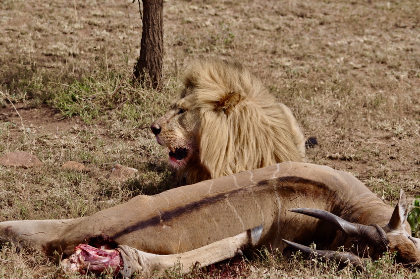 作者運(yùn)氣不錯(cuò),在塞倫蓋蒂巡游時(shí)巧遇一頭雄獅守護(hù)在一頭被咬死的大羚羊旁。