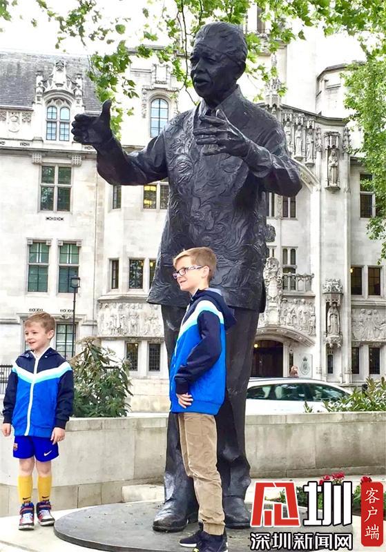 孩子們和曼德拉塑像合影。李仁奇攝