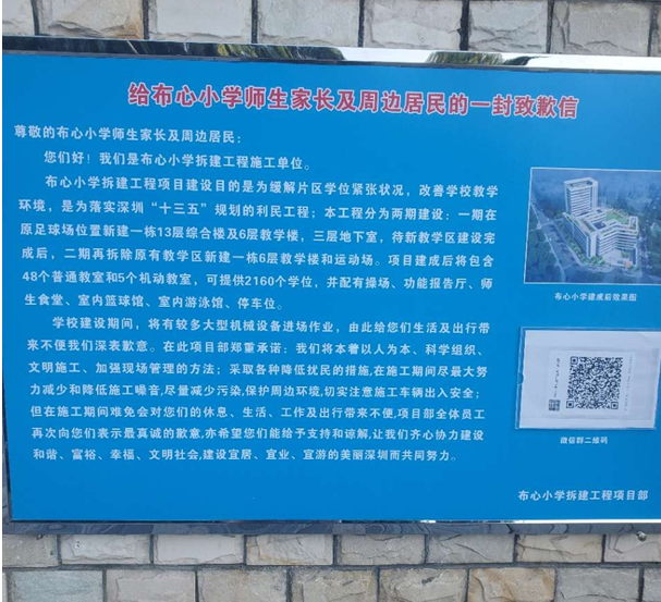 11月9日,有市民在深圳論壇發(fā)帖反映稱,“小孩如今就讀布心小學(xué)??砷_學(xué)一個月后,就看到校內(nèi)有公示說學(xué)校將會原地重建。”該家長對學(xué)生的安全情況表示擔(dān)憂:“這幾年因地下結(jié)構(gòu)受影響而導(dǎo)致路面坍塌的情況時有發(fā)生,現(xiàn)如今要在與教室目測距離不超過五米的地方建兩座分別為13層和6層的建筑,這樣大的工程量如果不分流,施工風(fēng)險可想而知。即使重建采用高新技術(shù),能夠保證教室的安全,但學(xué)生又如何能在學(xué)校與工地的混合期里度過至少四年以上的工期?粉塵和噪音對學(xué)生的影響也很大也可想而知。”