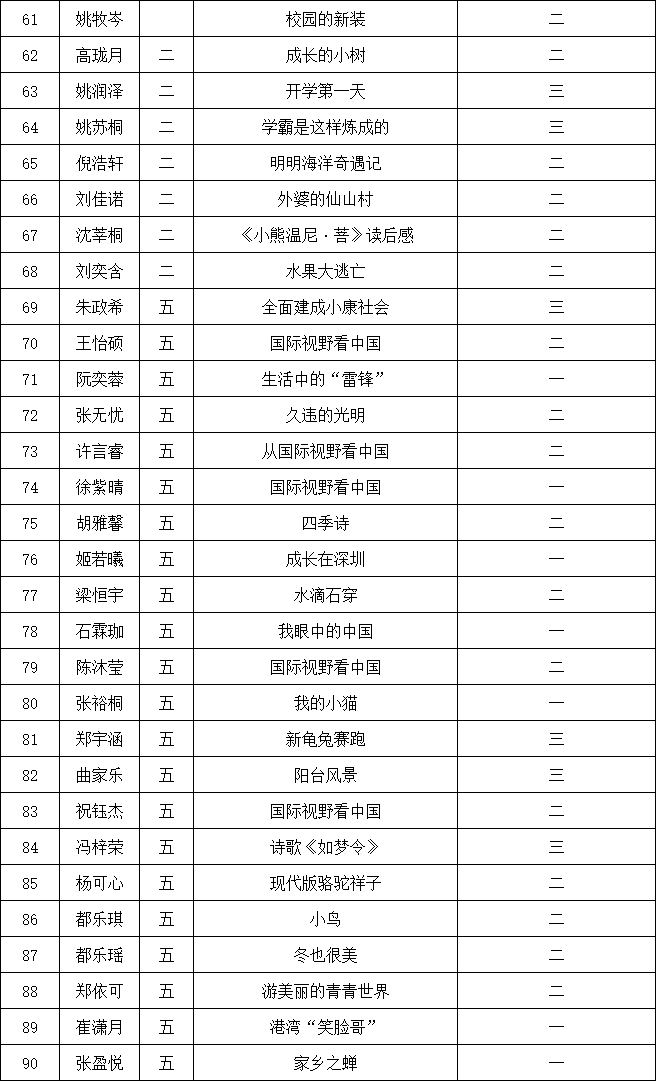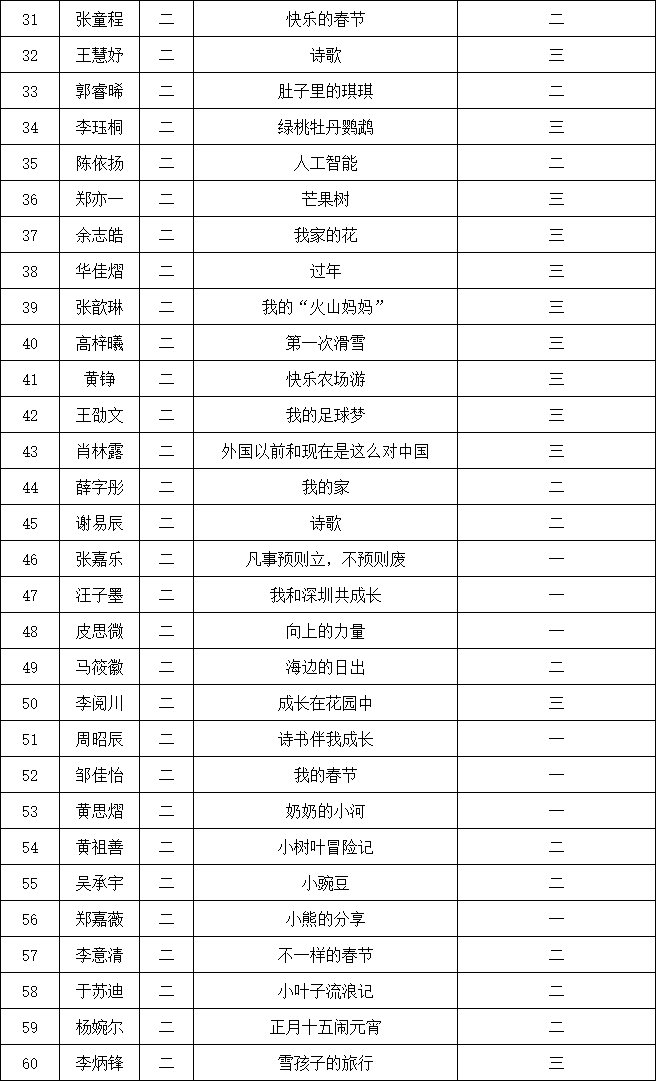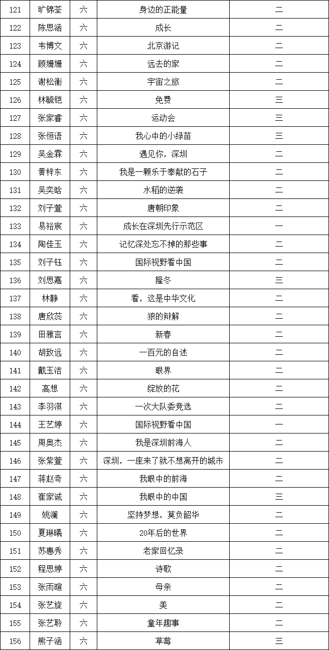 自2021年1月,活動(dòng)征稿啟動(dòng)以來(lái),獲得了深圳市廣大中小學(xué)生、教師、文學(xué)愛(ài)好者的熱烈響應(yīng)積極參與,吸引了深圳百余所學(xué)校的上萬(wàn)人關(guān)注報(bào)名?,F(xiàn)公布南山實(shí)驗(yàn)教育集團(tuán)前海港灣學(xué)校校園專場(chǎng)晉級(jí)復(fù)賽名單如下: