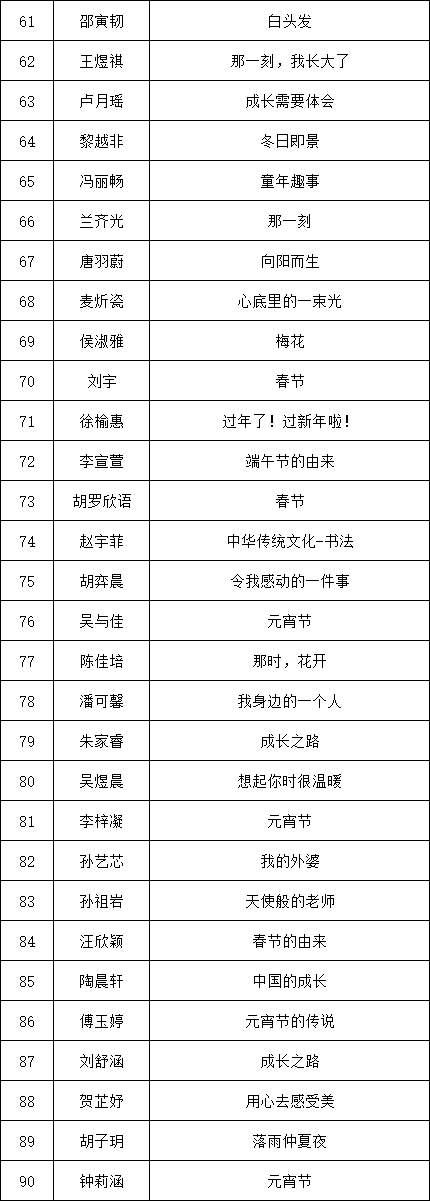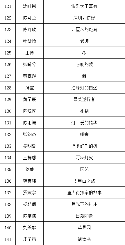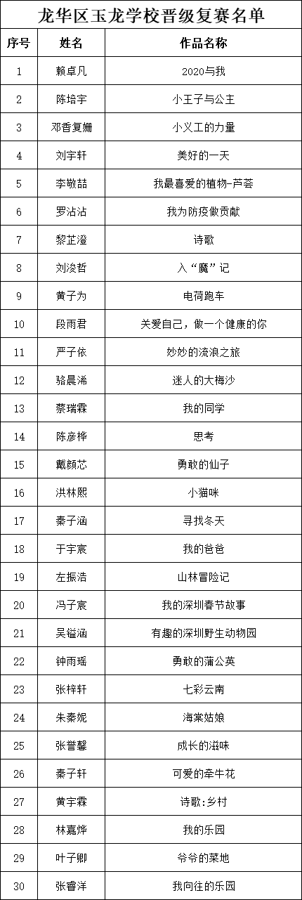 自2021年1月,活動(dòng)征稿啟動(dòng)以來,獲得了深圳市廣大中小學(xué)生、教師、文學(xué)愛好者的熱烈響應(yīng)積極參與,吸引了深圳百余所學(xué)校的上萬人關(guān)注報(bào)名?,F(xiàn)公布龍華區(qū)玉龍學(xué)校專場(chǎng)晉級(jí)復(fù)賽名單如下: