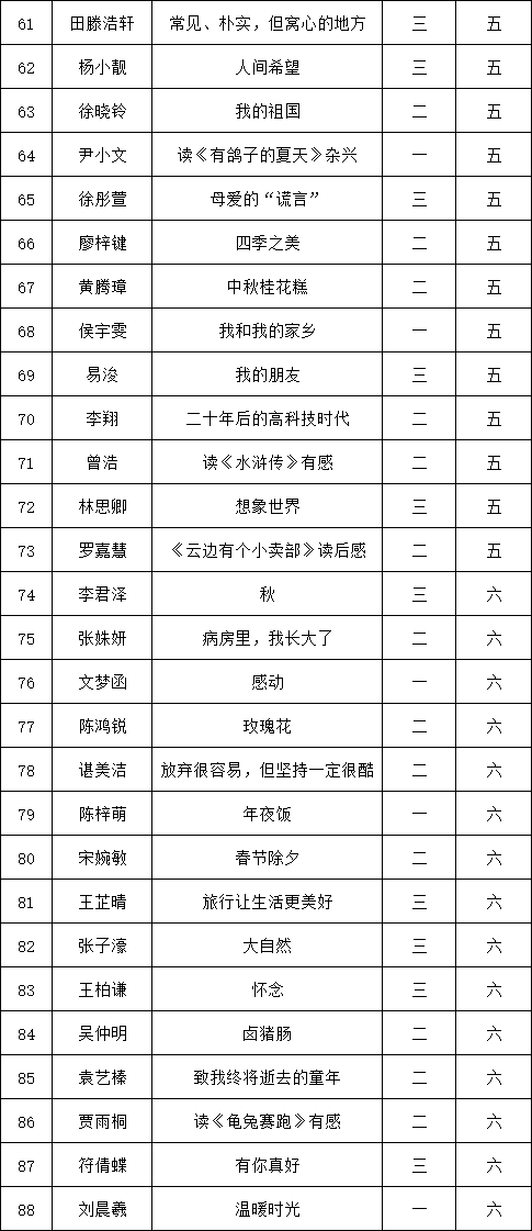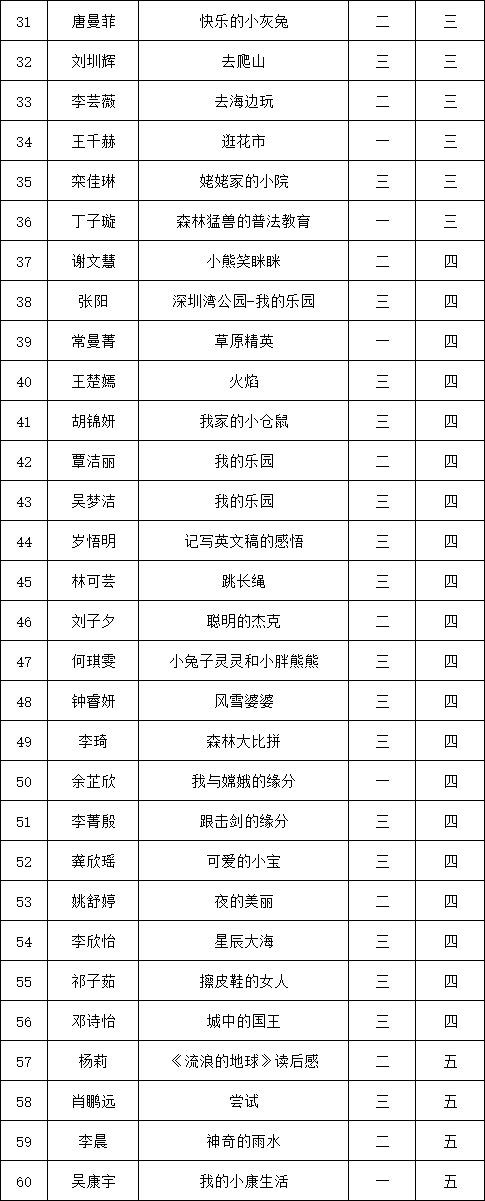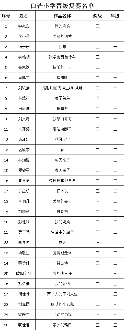 自2021年1月,活動(dòng)征稿啟動(dòng)以來,獲得了深圳市廣大中小學(xué)生、教師、文學(xué)愛好者的熱烈響應(yīng)積極參與,吸引了深圳百余所學(xué)校的上萬人關(guān)注報(bào)名?,F(xiàn)公布深圳市南山實(shí)驗(yàn)教育集團(tuán)白芒小學(xué)專場晉級(jí)復(fù)賽名單如下: