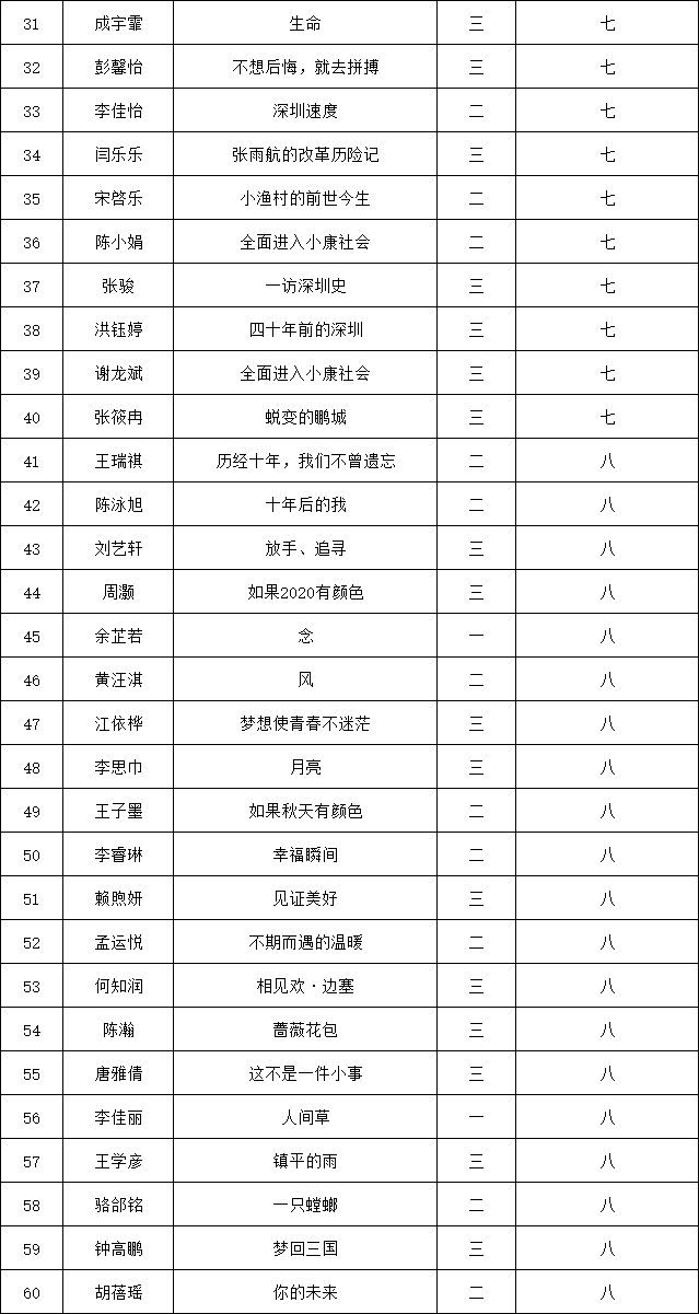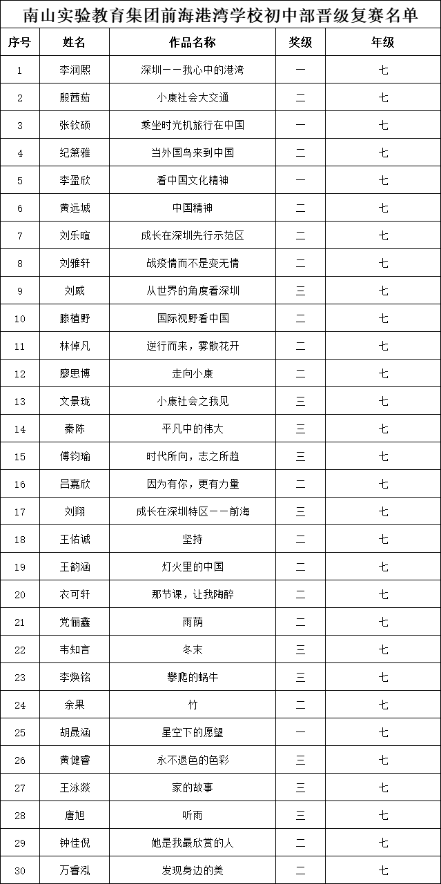 自2021年1月,活動(dòng)征稿啟動(dòng)以來,獲得了深圳市廣大中小學(xué)生、教師、文學(xué)愛好者的熱烈響應(yīng)積極參與,吸引了深圳百余所學(xué)校的上萬人關(guān)注報(bào)名。現(xiàn)公布南山實(shí)驗(yàn)教育集團(tuán)前海港灣學(xué)校(初中部)專場晉級復(fù)賽名單如下: