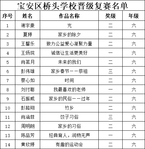 自2021年1月,活動征稿啟動以來,獲得了深圳市廣大中小學(xué)生、教師、文學(xué)愛好者的熱烈響應(yīng)積極參與,吸引了深圳百余所學(xué)校的上萬人關(guān)注報名?,F(xiàn)公布寶安區(qū)橋頭學(xué)校晉級復(fù)賽名單如下: