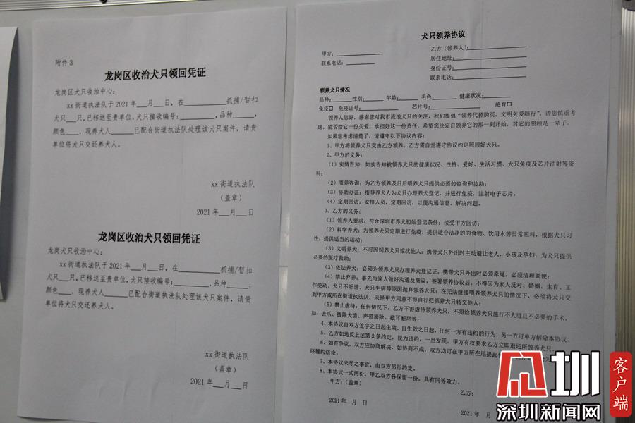公告板張貼的犬只領(lǐng)回憑證和領(lǐng)養(yǎng)協(xié)議。