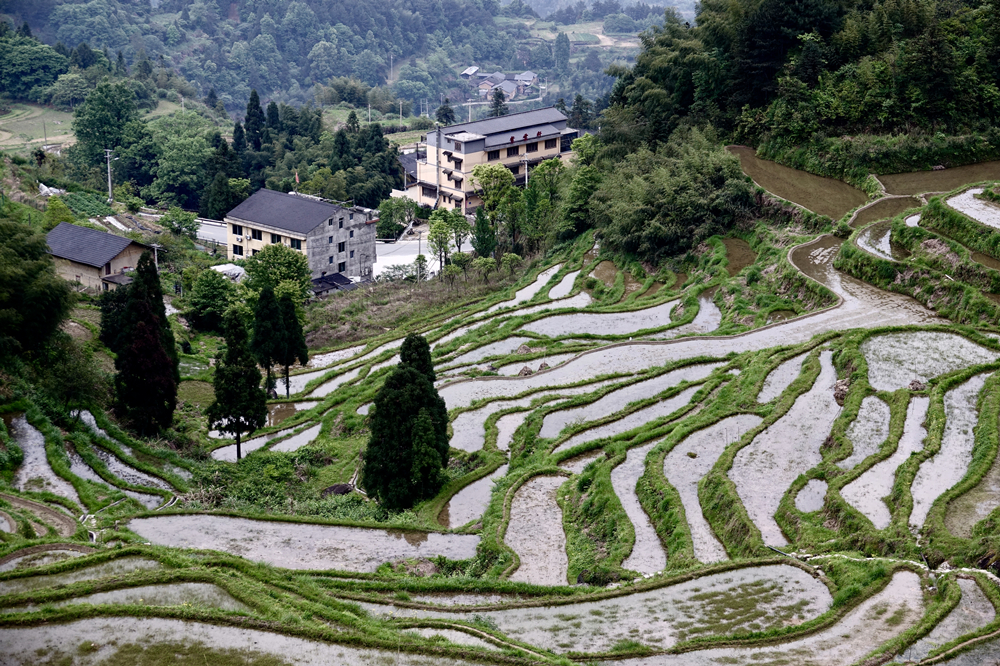或?qū)捇蛘奶萏?,一長(zhǎng)條一小塊,不規(guī)則地依山勢(shì)上下伸展。李仁奇 攝