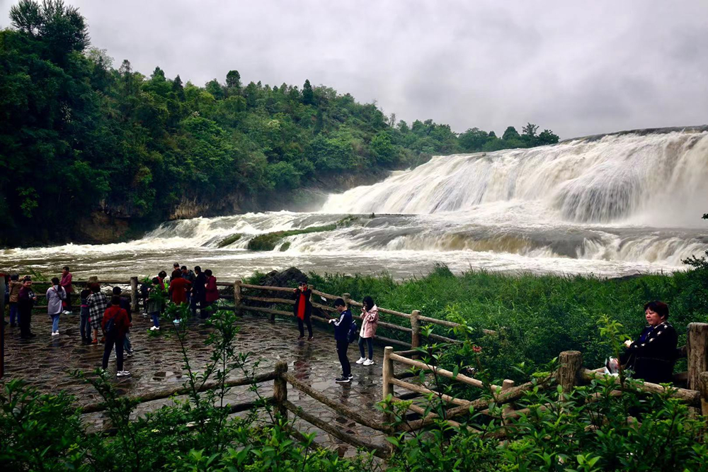 陡坡塘瀑布位于黃果樹瀑布上游1公里處,瀑頂寬105米,高21米,是黃果樹瀑布群中瀑頂最寬的瀑布。李仁奇 攝
