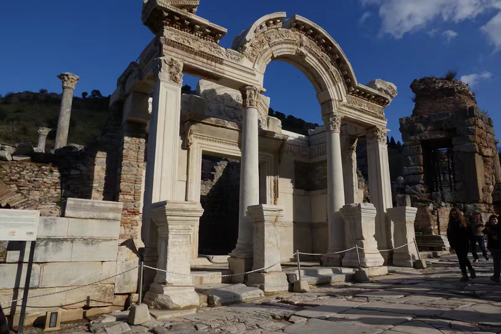 哈德良神廟就在圖書館斜對(duì)面,是典型柯林斯式神廟的代表,內(nèi)墻廊柱上有不同神話人物的雕刻,拱門上有精美的浮雕,前側(cè)拱門上是幸運(yùn)女神的頭像,內(nèi)側(cè)拱門上是張開雙臂的蛇發(fā)女妖美杜莎的雕像。李仁奇 攝