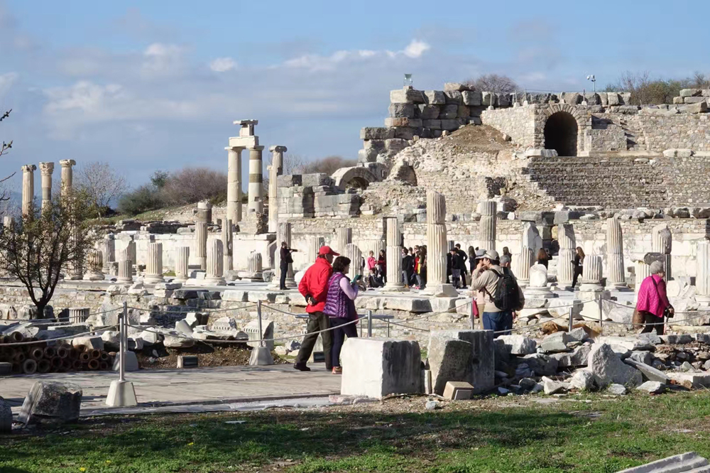 立柱背后是市政廳遺址。經(jīng)過(guò)幾百年的地貌變遷,以弗所的入??跐u漸被淤泥填塞,它賴以生存的海洋貿(mào)易遂告終結(jié),加上地中海沿岸頻發(fā)的地震,以弗所難逃被遺棄的噩運(yùn),這座新約《圣經(jīng)》中出現(xiàn)過(guò)的城市,最終淪為一片大理石廢墟。李仁奇 攝