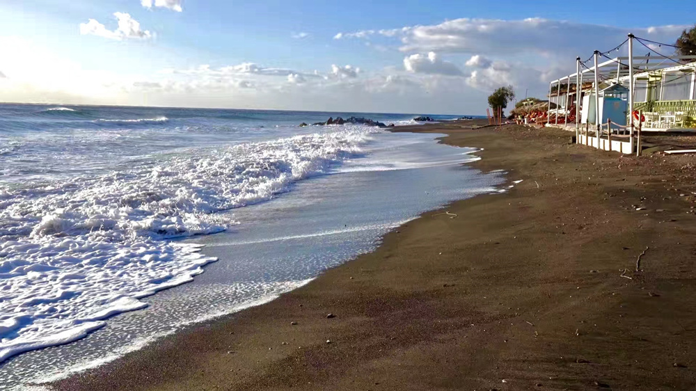 黑沙灘是圣托里尼有名的礦物沙灘,在旅游旺季時游人非常多。這里的沙灘其實是火山噴發(fā)后的火山灰沉積下來的小沙石,經(jīng)過長期的風(fēng)化形成了如今的黑沙灘。李仁奇 攝