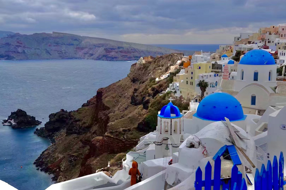 小鎮(zhèn)上依山而建的白色房屋,藍(lán)色穹頂,其間還點(diǎn)綴著紅、黃、粉以及無數(shù)種漸變的顏色,錯(cuò)落有致。李仁奇 攝