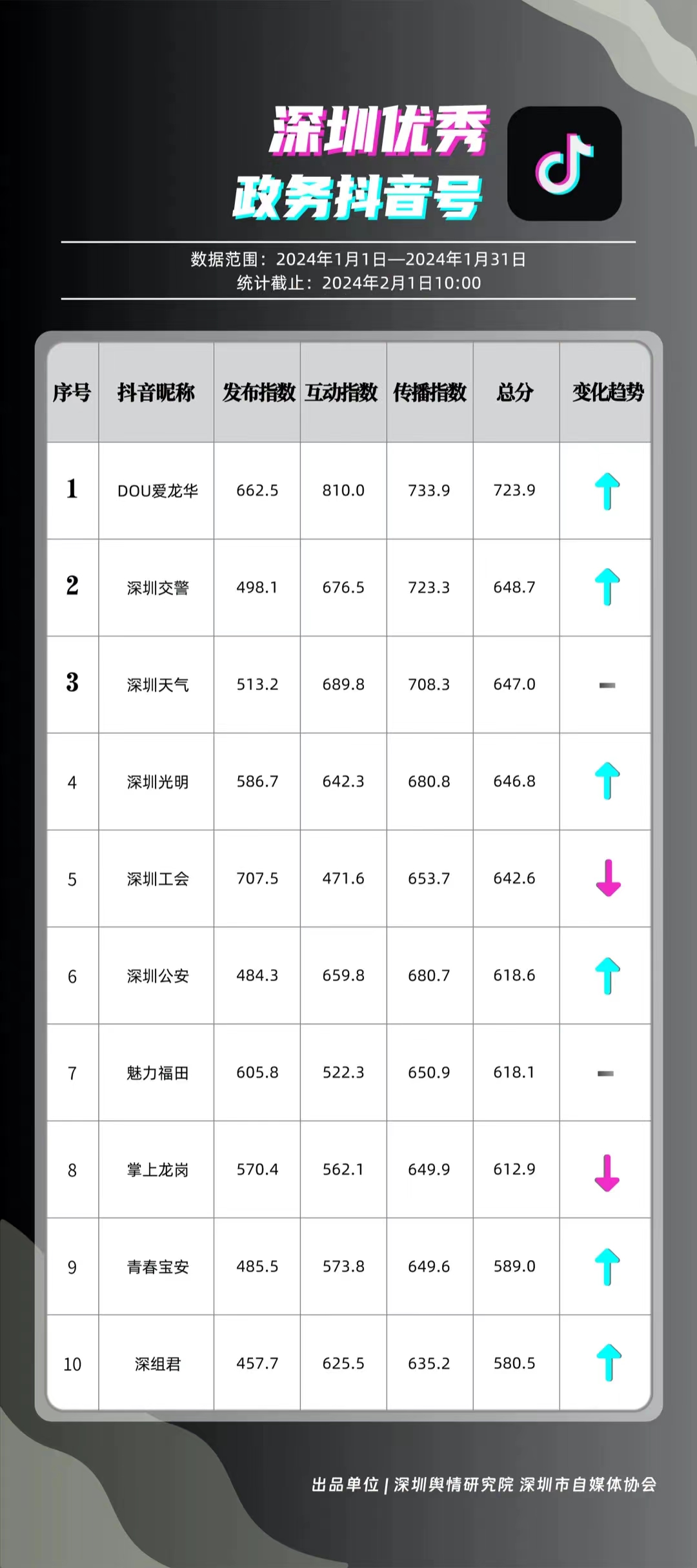 深圳新聞網(wǎng)2月9日訊(記者 陳曉君 實習(xí)生 張馳)2月8日,深圳輿情研究院、深圳市自媒體協(xié)會聯(lián)合推出《深圳優(yōu)秀政務(wù)新媒體矩陣》(2024年1月期),市衛(wèi)生健康委、市氣象局、福田區(qū)、光明區(qū)、龍崗區(qū)、龍華區(qū)、市公安局、市應(yīng)急管理局、市交通警察局、羅湖區(qū)的新媒體矩陣獲評“深圳優(yōu)秀政務(wù)新媒體矩陣”。這些矩陣在內(nèi)容發(fā)布、受眾互動和信息傳播方面取得了較好成績,并在深圳政務(wù)新媒體規(guī)范有序發(fā)展進程中發(fā)揮著積極作用。