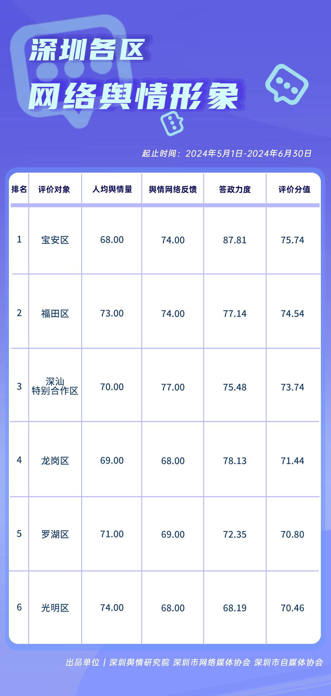 在《深圳各區(qū)網(wǎng)絡(luò)輿情形象榜》中,寶安區(qū)以75.74分的高分榮登榜首,其在答政力度上的表現(xiàn)尤為突出,得分高達(dá)87.81分,這充分展現(xiàn)了寶安區(qū)對(duì)網(wǎng)絡(luò)問(wèn)政工作的重視程度。緊隨其后的是福田區(qū),以74.54分的評(píng)價(jià)分值位列第二。福田區(qū)在輿情處置相關(guān)的多個(gè)評(píng)價(jià)指標(biāo)上均表現(xiàn)出色,每項(xiàng)指標(biāo)得分均超過(guò)73分。深汕特別合作區(qū)、龍崗區(qū)、羅湖區(qū)和光明區(qū)則分別位列第三至第六名。這些區(qū)域同樣展現(xiàn)出對(duì)民眾聲音的高度重視,將民意視為改進(jìn)工作的重要參考,并且積極采取措施主動(dòng)回應(yīng)民眾關(guān)切,體現(xiàn)了其在網(wǎng)絡(luò)輿情管理上的積極態(tài)度和有效策略。