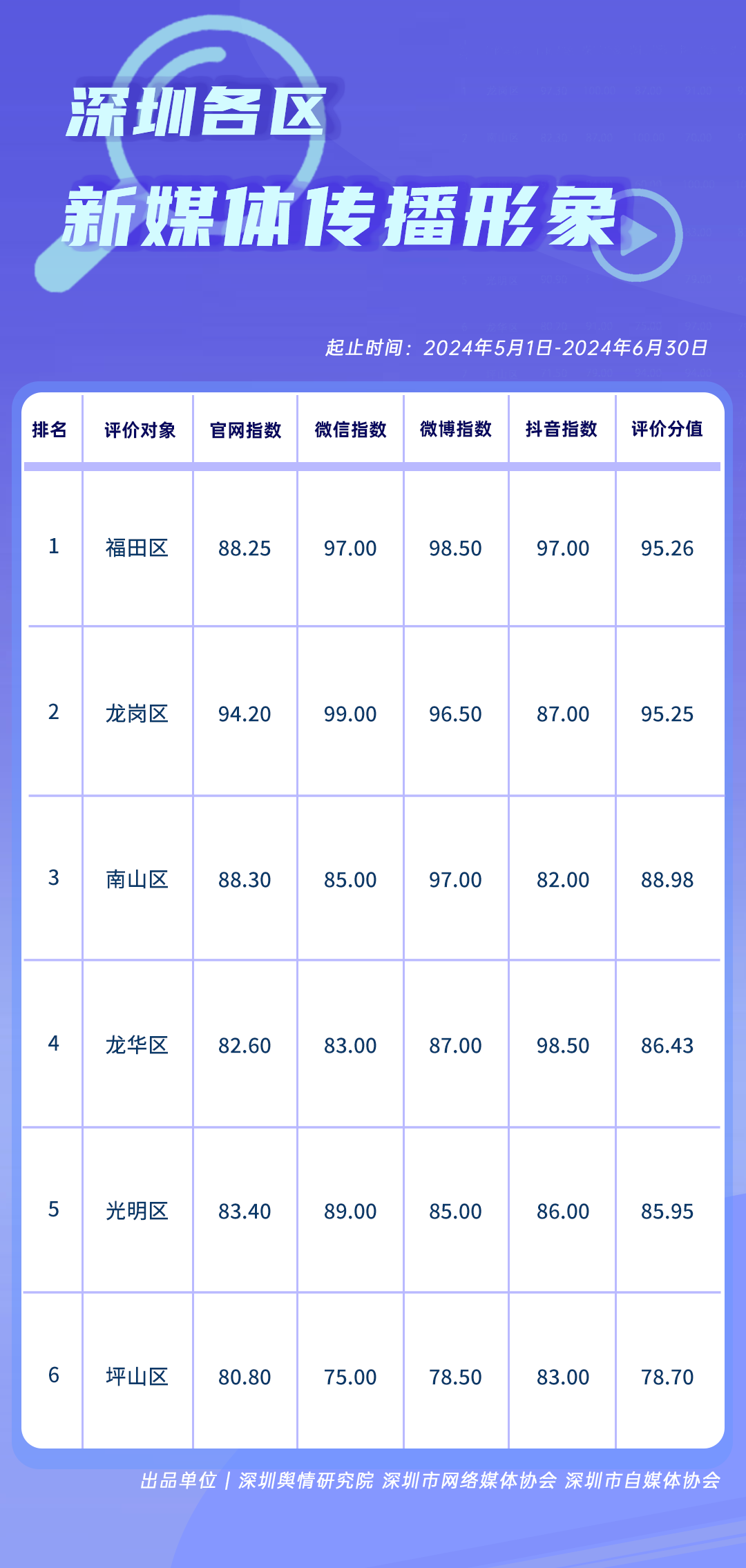 5-6月,在《深圳各區(qū)新媒體傳播形象榜》中,福田區(qū)、龍崗區(qū)、南山區(qū)、龍華區(qū)、光明區(qū)、坪山區(qū)均展現(xiàn)了出色的表現(xiàn),成功躋身榜單前六強(qiáng)。其中福田區(qū)、龍崗區(qū)超過(guò)95分的高分表現(xiàn)尤為搶眼,反映出兩區(qū)在新媒體傳播上的深度投入和創(chuàng)新實(shí)踐。南山區(qū)則以88.98分的成績(jī),榮獲榜單第三名,顯示出其在提升新媒體傳播能力方面的不懈努力。龍華區(qū)、光明區(qū)和坪山區(qū)緊隨其后,分別位列第四至第六名,表明這些區(qū)域同樣在新媒體傳播領(lǐng)域不斷探索和深化工作,尋求創(chuàng)新的方式來(lái)提升自身的新媒體形象。整體來(lái)看,上榜區(qū)域的新媒體傳播工作不僅提升了信息傳播效率,也為塑造深圳各區(qū)的正面形象做出了積極貢獻(xiàn)。