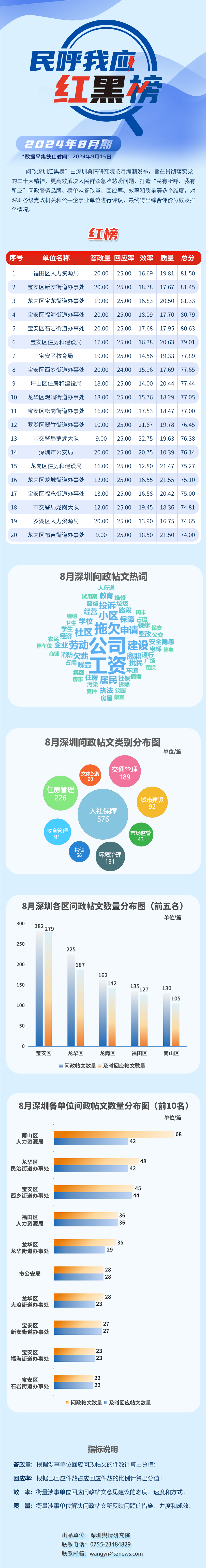 “深圳民呼我應(yīng)紅黑榜”由深圳輿情研究院按月編制發(fā)布,旨在貫徹落實(shí)黨的二十大精神,更高效解決人民群眾急難愁盼問題,打造“民有所呼、我有所應(yīng)”問政服務(wù)品牌。榜單從答政量、回應(yīng)率、效率和質(zhì)量等多個(gè)維度對(duì)深圳各級(jí)黨政機(jī)關(guān)和公共企事業(yè)單位進(jìn)行評(píng)議,最終得出綜合評(píng)價(jià)分?jǐn)?shù)及排名情況。