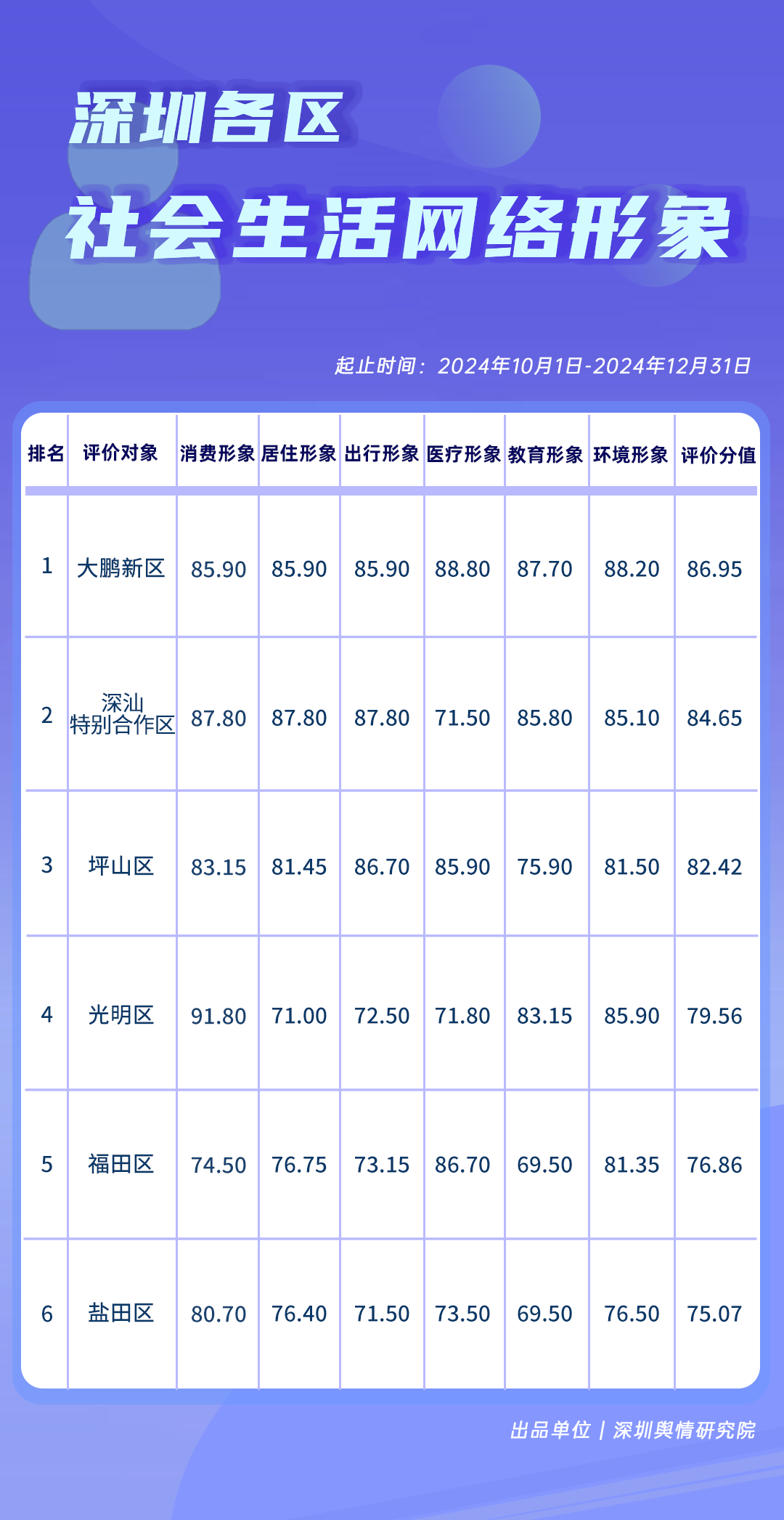 10-12月,《深圳各區(qū)社會生活網(wǎng)絡(luò)形象榜》中,大鵬新區(qū)、深汕特別合作區(qū)、坪山區(qū)綜合評價分值在80分以上,表現(xiàn)優(yōu)異。光明區(qū)、福田區(qū)、鹽田區(qū)各有所長,分別占據(jù)了榜單第四至第六的位置,成為深圳各區(qū)致力于改善社會民生、促進(jìn)區(qū)域協(xié)調(diào)發(fā)展的生動范例。