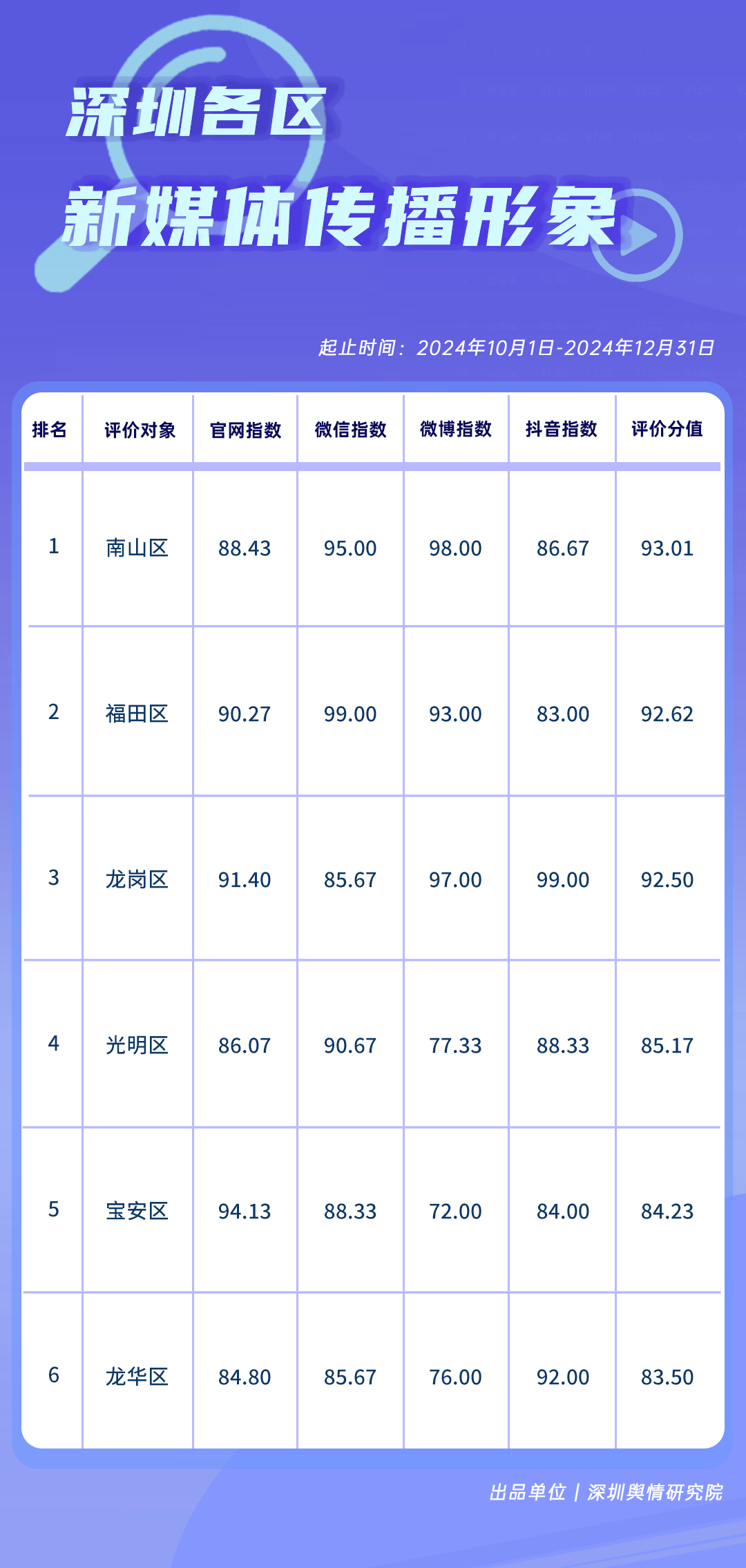 10-12月,福田區(qū)、龍崗區(qū)、光明區(qū)、龍華區(qū)、南山區(qū)、寶安區(qū)登上榜單前六。榜單中,福田區(qū)、龍崗區(qū)、光明區(qū)位列前三,綜合評價分值均在80分以上,居于榜單第四至第六名的龍華區(qū)、南山區(qū)、寶安區(qū)也在積極塑造網(wǎng)絡(luò)形象的道路上不斷邁進(jìn),展現(xiàn)了各區(qū)在網(wǎng)絡(luò)形象建設(shè)領(lǐng)域的蓬勃活力與持續(xù)努力。