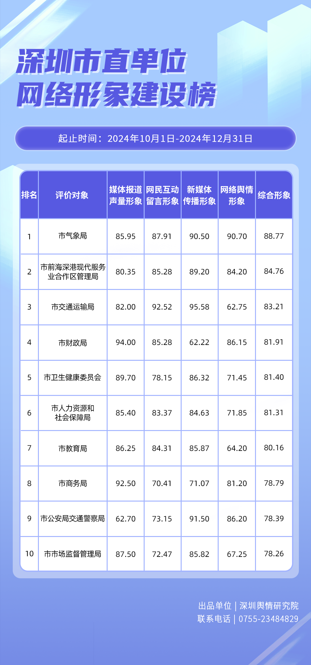 為全面評估深圳各區(qū)各單位網(wǎng)絡(luò)形象建設(shè)情況,助力各區(qū)各單位持續(xù)響應(yīng)居民對美好生活的期許,賦能城市高質(zhì)量發(fā)展,深圳輿情研究院推出“深圳各區(qū)各單位網(wǎng)絡(luò)形象建設(shè)榜”,從網(wǎng)絡(luò)聚合聲量、留言互動成效、社會生活評價、輿情管理能力及新媒體傳播水平等方面,多維度分析深圳各區(qū)(含大鵬新區(qū)、深汕特別合作區(qū))、各市直單位(市直屬單位、直屬部門)的網(wǎng)絡(luò)形象建設(shè)成果,凸顯各區(qū)各單位的“共性”與“個性”。