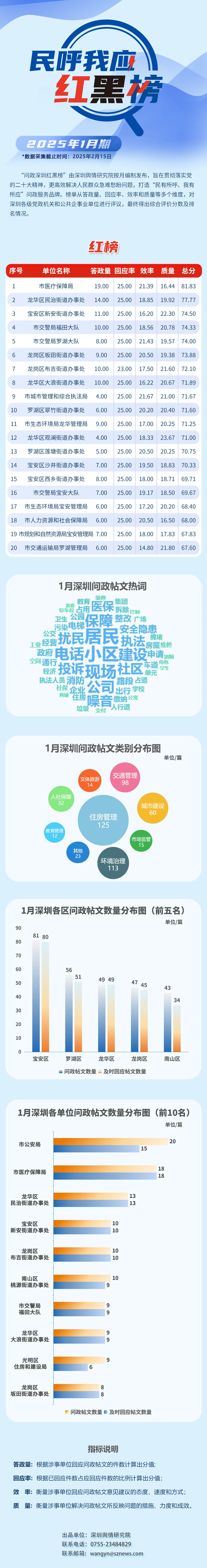 本期榜單采集的帖文主要來自深圳市及各區(qū)政府官網(wǎng)、深圳論壇、人民網(wǎng)領(lǐng)導(dǎo)留言板、深圳新聞網(wǎng)“民呼我應(yīng)”等平臺,所采集帖文發(fā)布時(shí)間為2025年1月1日至1月31日,采集截止時(shí)間為2025年2月15日。
