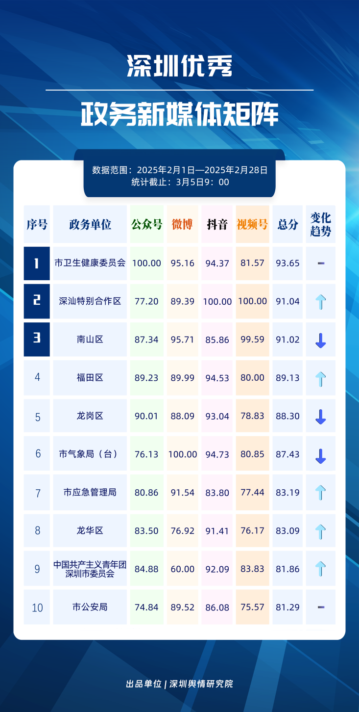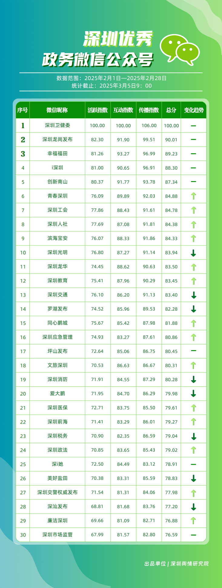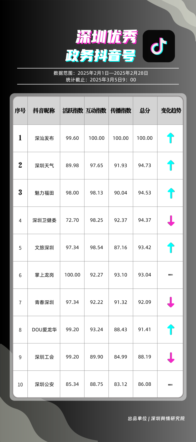 2025年2月期《深圳優(yōu)秀政務(wù)新媒體矩陣》發(fā)布,本期榜單框架有所優(yōu)化,公眾號、微博號、抖音號、視頻號得分在綜合計(jì)算時(shí)的權(quán)重調(diào)整為30%、20%、30%、20%。公眾號榜單中,根據(jù)閱讀量超10萬次的文章篇數(shù),在傳播指數(shù)額外加分,激勵優(yōu)質(zhì)內(nèi)容產(chǎn)出。接下來,讓我們一同揭曉,2月哪些矩陣成為政務(wù)信息傳播與服務(wù)創(chuàng)新標(biāo)桿,為政務(wù)新媒體矩陣創(chuàng)新發(fā)展樹立高質(zhì)量發(fā)展范式。