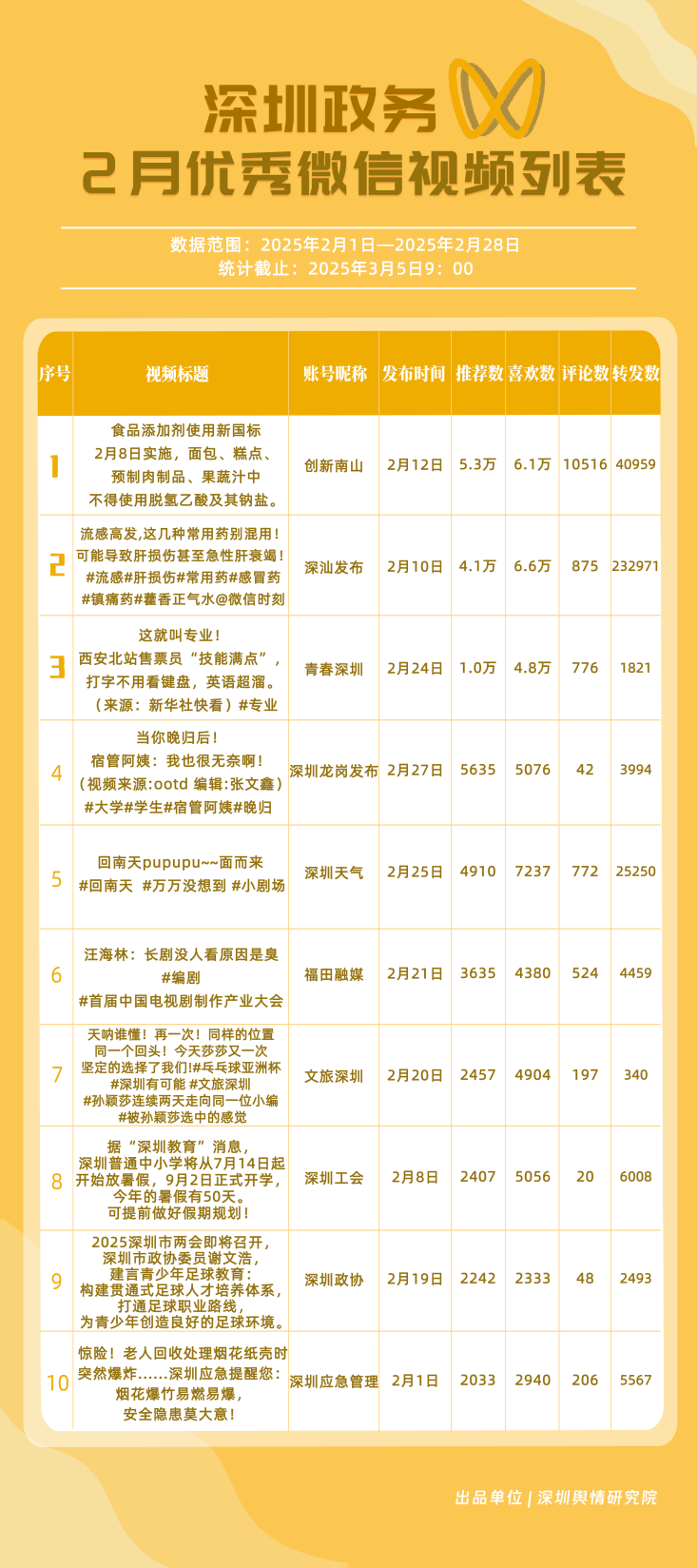 2月,“深汕發(fā)布”“深圳天氣”“魅力福田”“深圳衛(wèi)健委”“文旅深圳”“掌上龍崗”“青春深圳”“DOU愛龍華”“深圳工會”“深圳公安”共10個(gè)政務(wù)抖音號獲得“深圳優(yōu)秀政務(wù)抖音號”稱號?!吧钌前l(fā)布”位于榜單第一名,值得關(guān)注的是,該賬號2月作品總分享數(shù)超20萬次,其中有關(guān)“華南地區(qū)回南天”的視頻單條分享量達(dá)到19萬次以上,展現(xiàn)出強(qiáng)勁的傳播力?!吧钲谔鞖狻薄镑攘ΩL铩薄吧钲谛l(wèi)健委”三賬號堅(jiān)持輸出優(yōu)質(zhì)內(nèi)容,得分均在94分以上,展現(xiàn)出深圳政務(wù)新媒體賬號在短視頻傳播領(lǐng)域的創(chuàng)新活力。