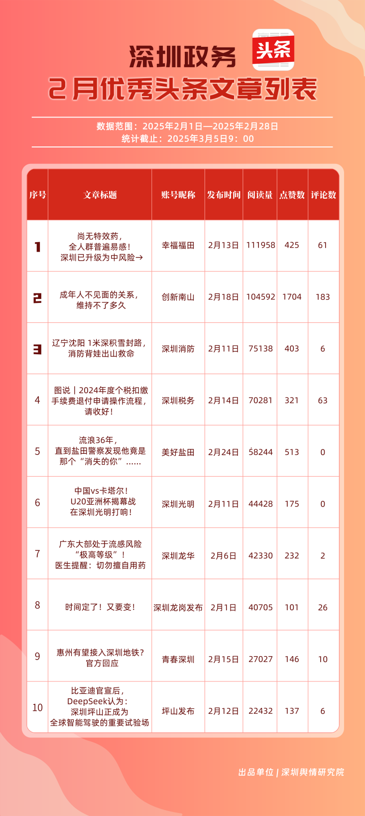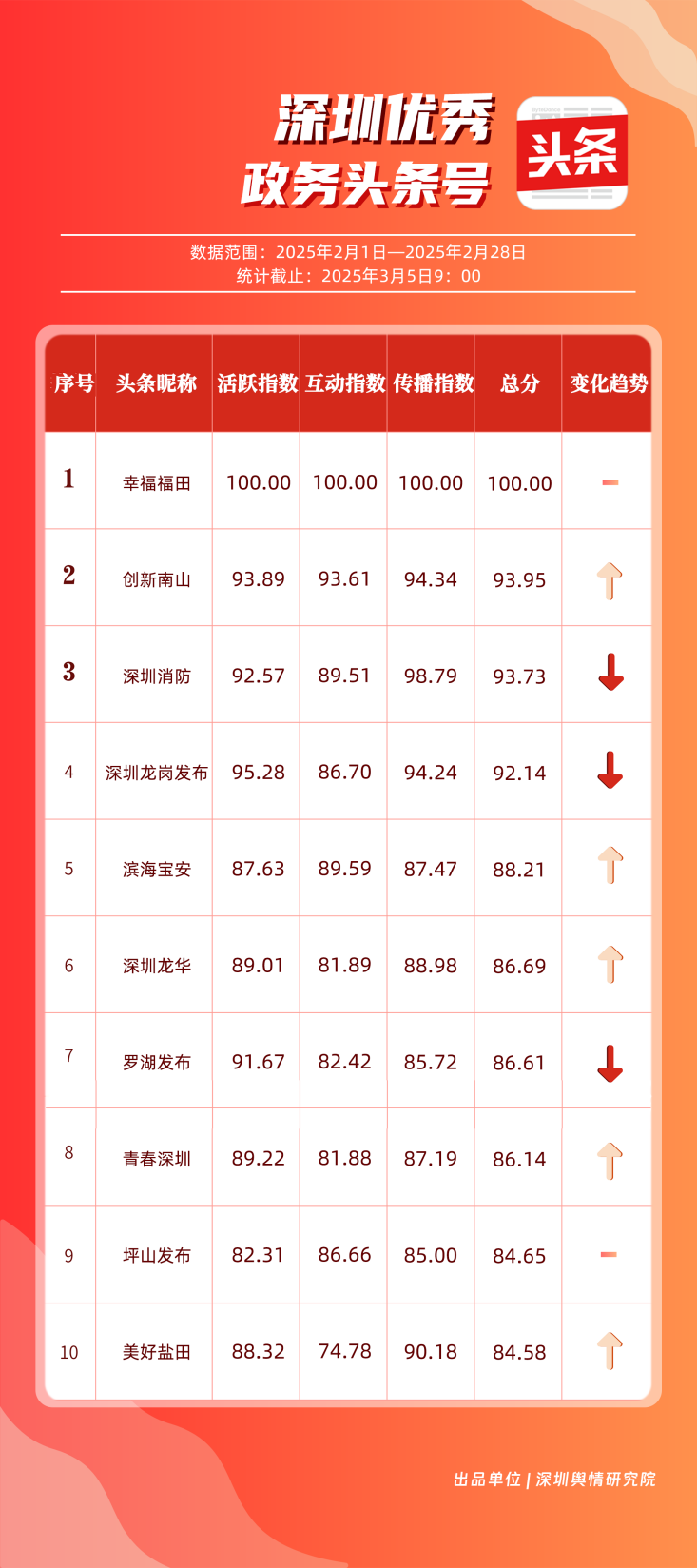 2月,“幸福福田”“創(chuàng)新南山”“深圳消防”“深圳龍崗發(fā)布”“濱海寶安”“深圳龍華”“羅湖發(fā)布”“青春深圳”“坪山發(fā)布”“美好鹽田”共10個(gè)政務(wù)頭條號入選“優(yōu)秀政務(wù)頭條號”榜單。“幸福福田”2月今日頭條作品總閱讀數(shù)超60萬,綜合實(shí)力較強(qiáng),多次位居頭條平臺榜單第一?!皠?chuàng)新南山”“深圳消防”“深圳龍崗發(fā)布”總分均在90分以上,展現(xiàn)出深圳政務(wù)頭條號的持續(xù)影響力,為其他政務(wù)賬號提供了可借鑒的運(yùn)營范例。