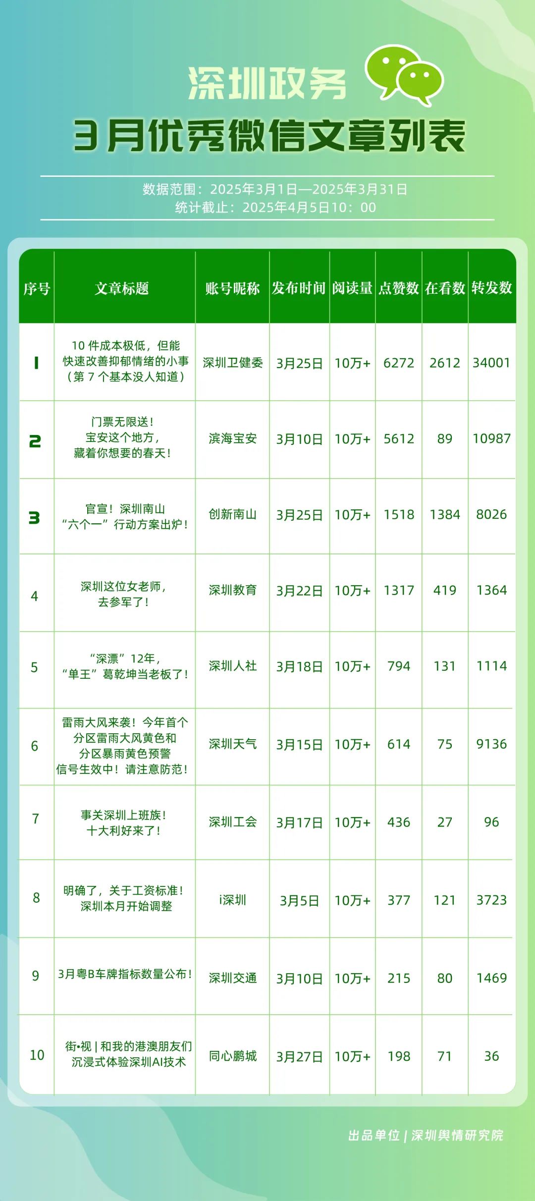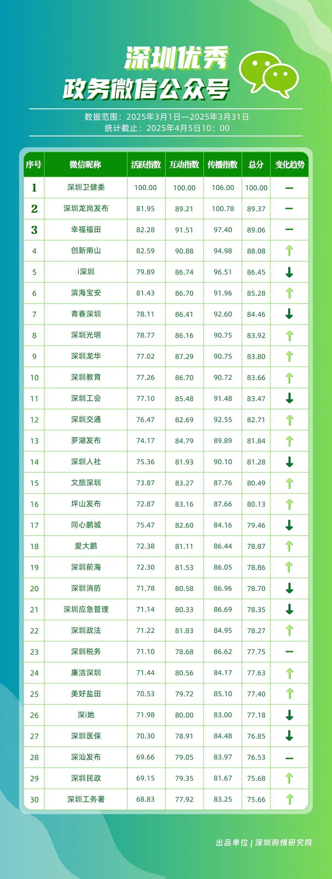 2025年3月期《深圳優(yōu)秀政務(wù)新媒體矩陣》發(fā)布,讓我們共同關(guān)注哪些矩陣以精準(zhǔn)傳播、智慧服務(wù)與創(chuàng)新實(shí)踐,在政務(wù)新媒體領(lǐng)域打造出具有示范價(jià)值的標(biāo)桿案例,以矩陣合力構(gòu)建政務(wù)傳播新生態(tài),為深圳城市網(wǎng)絡(luò)形象塑造持續(xù)注入新動(dòng)能。