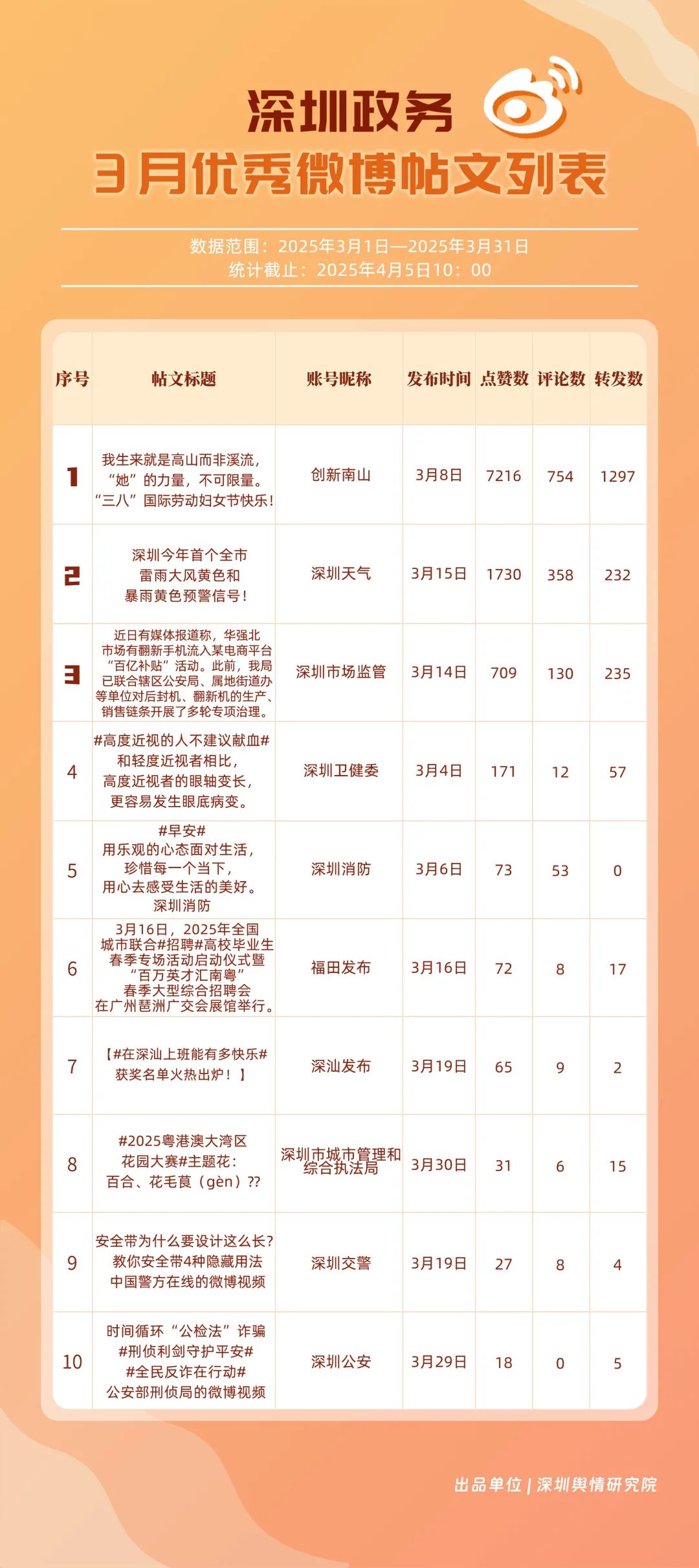 3月,“深圳天氣”“創(chuàng)新南山”“深圳衛(wèi)健委”“深圳消防”“福田發(fā)布”“深圳應(yīng)急管理”“深圳公安”“深圳市場監(jiān)管”“深圳龍崗發(fā)布”“深圳市城市管理和綜合執(zhí)法局”等20個(gè)賬號(hào)入選“優(yōu)秀政務(wù)微博號(hào)”。值得一提的是,“深圳天氣”賬號(hào)在3月共獲得點(diǎn)贊超11萬,相較其他賬號(hào)具備顯著優(yōu)勢?!皠?chuàng)新南山”“深圳衛(wèi)健委”“深圳消防”也位列前茅,分差微小,競爭激烈。從領(lǐng)域分布來看,上榜賬號(hào)不僅包括區(qū)級(jí)賬號(hào),還涵蓋民生服務(wù)、應(yīng)急科普、城市治理等單位賬號(hào),體現(xiàn)了深圳政務(wù)新媒體在多領(lǐng)域的強(qiáng)大影響力。