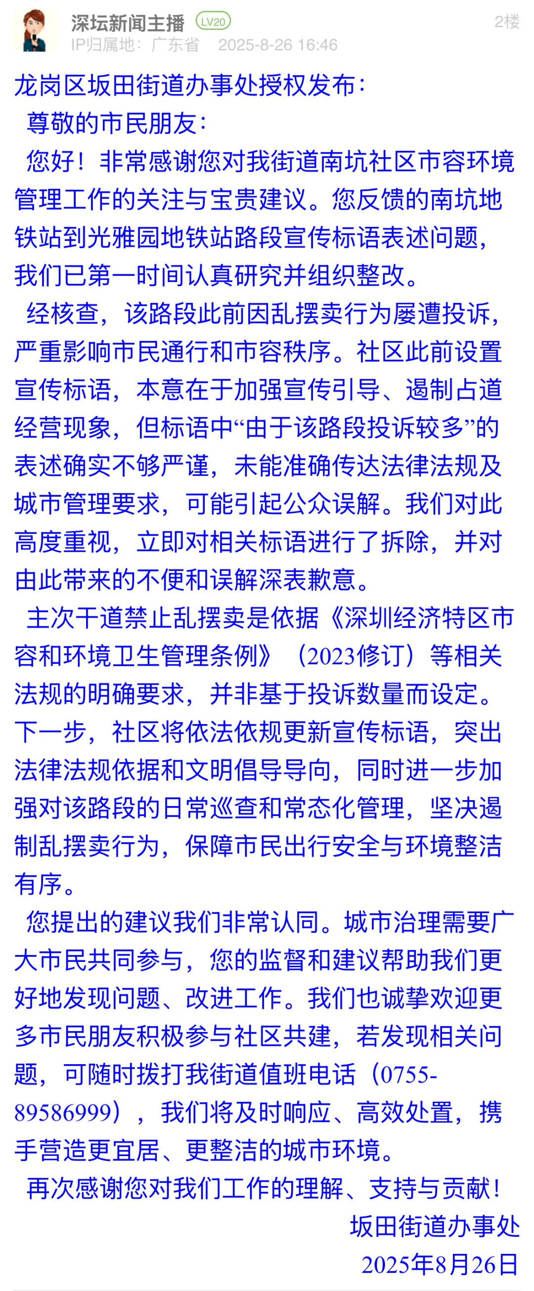 案例點(diǎn)評(píng):標(biāo)語(yǔ)表述不嚴(yán)謹(jǐn)可能引發(fā)公眾誤解,坂田街道辦展現(xiàn)出高效務(wù)實(shí)的態(tài)度,第一時(shí)間拆除涉事標(biāo)語(yǔ),計(jì)劃更新標(biāo)語(yǔ),明確標(biāo)語(yǔ)中提及的禁擺依據(jù)為法規(guī)要求而非投訴數(shù)量?;貞?yīng)中,街道主動(dòng)致歉并公開整改邏輯,展現(xiàn)“直面問(wèn)題不推諉”的擔(dān)當(dāng),更以“邀請(qǐng)市民參與共建”為切入點(diǎn),構(gòu)建“政府主導(dǎo)+公眾監(jiān)督”的治理閉環(huán)。此次整改有效化解因標(biāo)語(yǔ)表述不當(dāng)引發(fā)的公眾疑慮,彰顯了“以民為師”的共治智慧。
