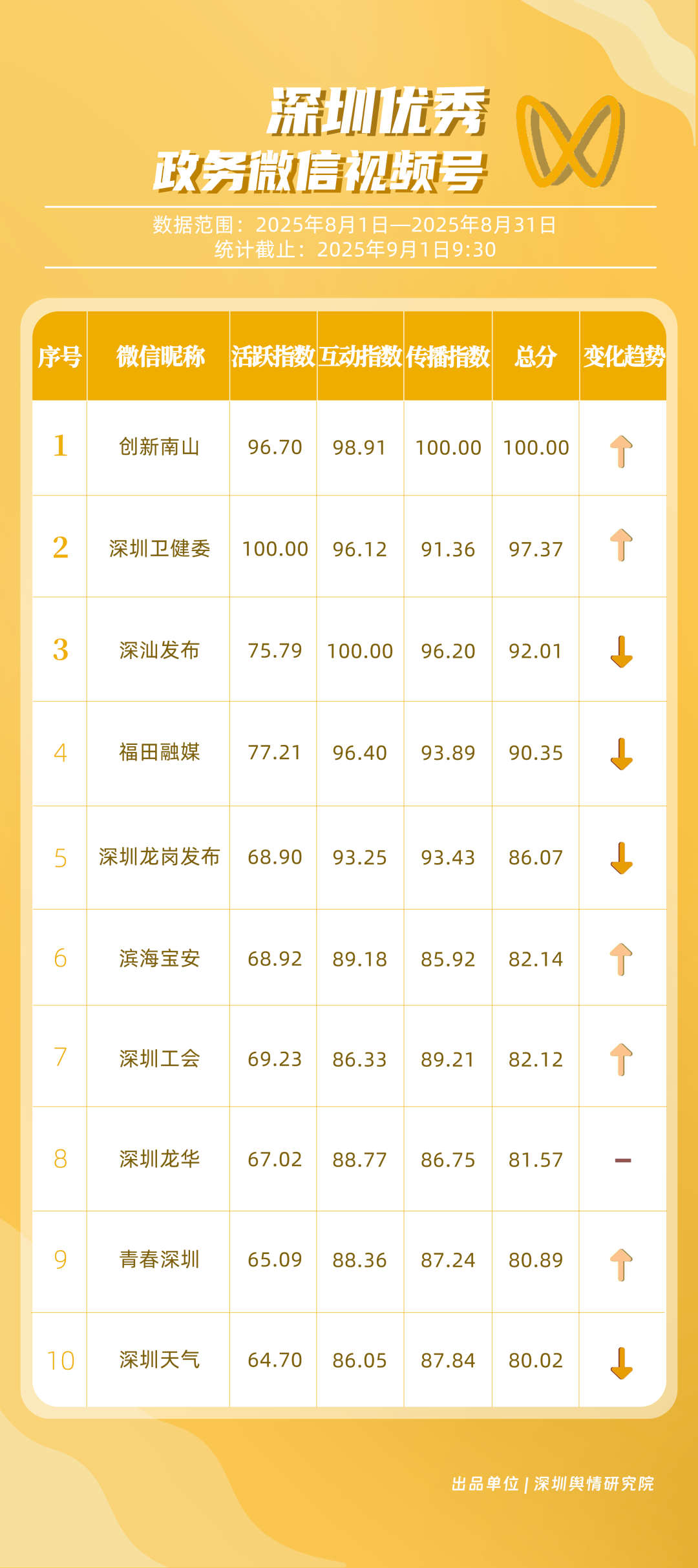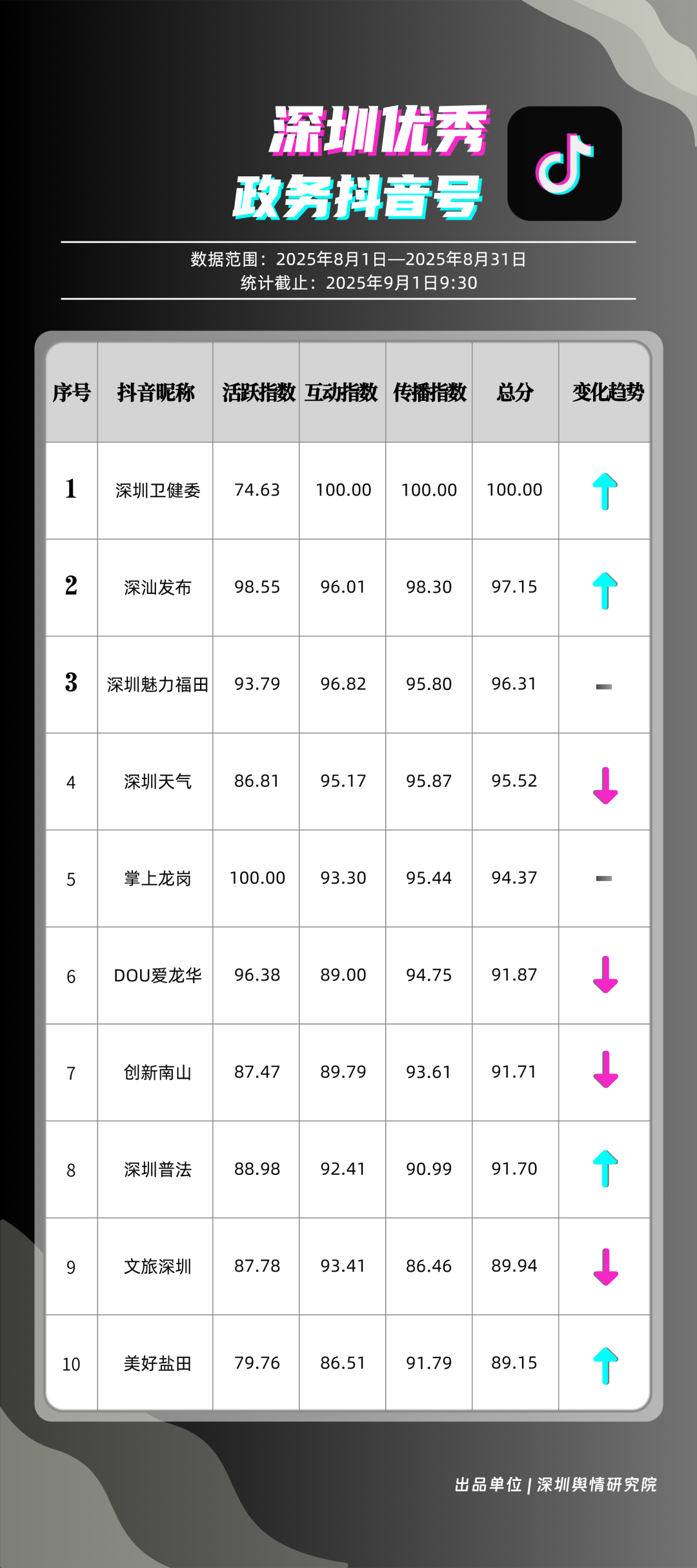 8月,“深圳衛(wèi)健委”“深汕發(fā)布”“深圳魅力福田”“深圳天氣”“掌上龍崗”“DOU愛龍華”“創(chuàng)新南山”“深圳普法”“文旅深圳”“美好鹽田”共10個(gè)政務(wù)抖音號(hào)獲得“優(yōu)秀政務(wù)抖音號(hào)”稱號(hào)?!吧钲谛l(wèi)健委”內(nèi)容吸引大量網(wǎng)民關(guān)注,4條視頻累計(jì)獲得超50萬(wàn)次點(diǎn)贊,排名從上期的第九名上升至第一名;“深汕發(fā)布”憑借較高的傳播指數(shù)評(píng)分,位列第二名,排名有所上升。“深圳魅力福田”“深圳天氣”等賬號(hào)緊隨其后,得分均在95分左右。上榜的優(yōu)秀政務(wù)抖音號(hào)深耕優(yōu)質(zhì)創(chuàng)作,精準(zhǔn)把握網(wǎng)民興趣點(diǎn),使作品收獲高點(diǎn)贊、高轉(zhuǎn)發(fā),推動(dòng)評(píng)論區(qū)形成良性互動(dòng)氛圍,以優(yōu)秀內(nèi)容提升政務(wù)傳播效能。