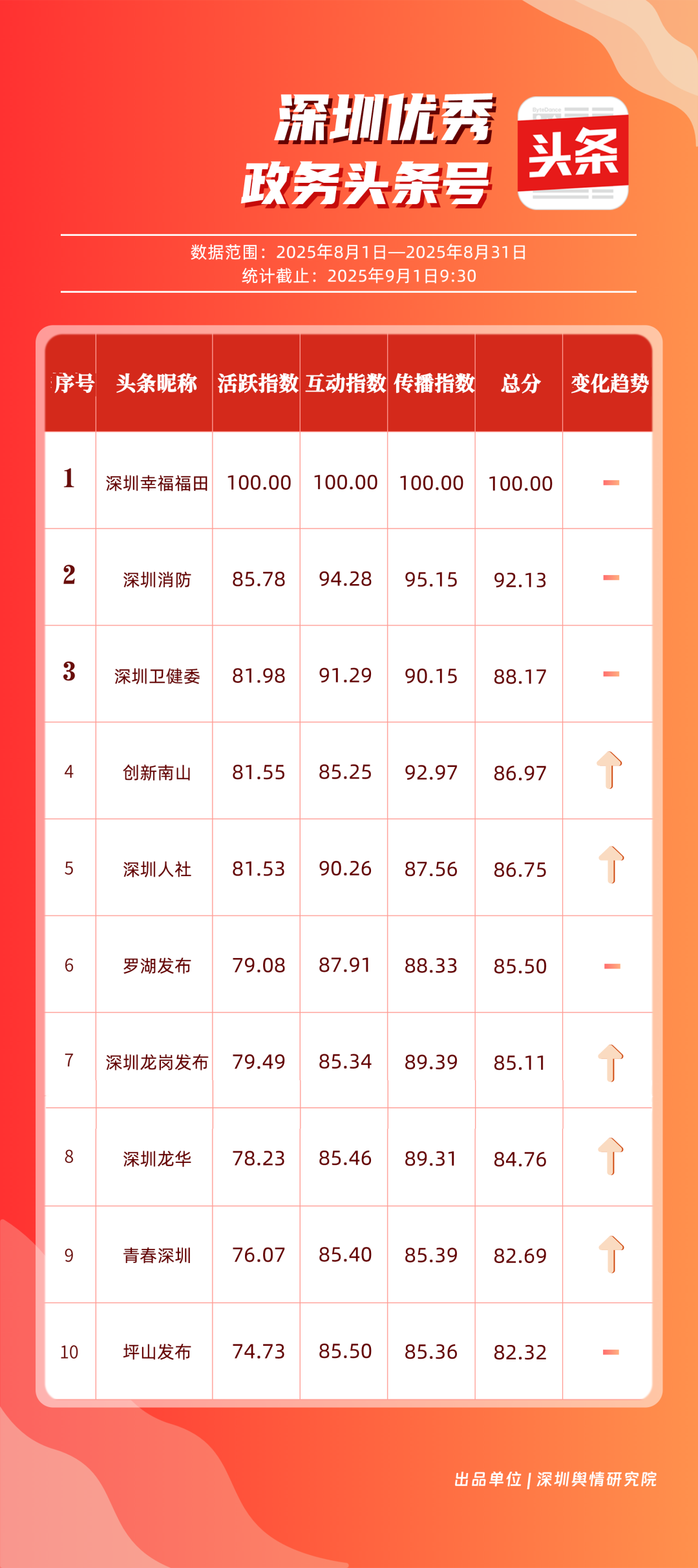 8月,“深圳幸福福田”“深圳消防”“深圳衛(wèi)健委”“創(chuàng)新南山”“深圳人社”“羅湖發(fā)布”“深圳龍崗發(fā)布”“深圳龍華”“青春深圳”“坪山發(fā)布”共10個(gè)政務(wù)頭條號(hào)入選“優(yōu)秀政務(wù)頭條號(hào)”榜單?!吧钲谛腋8L铩睉{借持續(xù)優(yōu)異的綜合表現(xiàn),以滿分成績(jī)穩(wěn)居榜單首位,彰顯出強(qiáng)大的政務(wù)傳播力與影響力;“深圳消防”“深圳衛(wèi)健委”則以穩(wěn)定的內(nèi)容質(zhì)量與深厚的民眾基礎(chǔ),持續(xù)為市民提供權(quán)威、及時(shí)的服務(wù)信息,排名穩(wěn)固?!皠?chuàng)新南山”“深圳人社”等上榜賬號(hào)亦表現(xiàn)亮眼,聚焦民生服務(wù)傳遞政策溫度,共同構(gòu)成政務(wù)新媒體矩陣的中堅(jiān)力量,為城市治理與民生服務(wù)注入鮮活動(dòng)能。