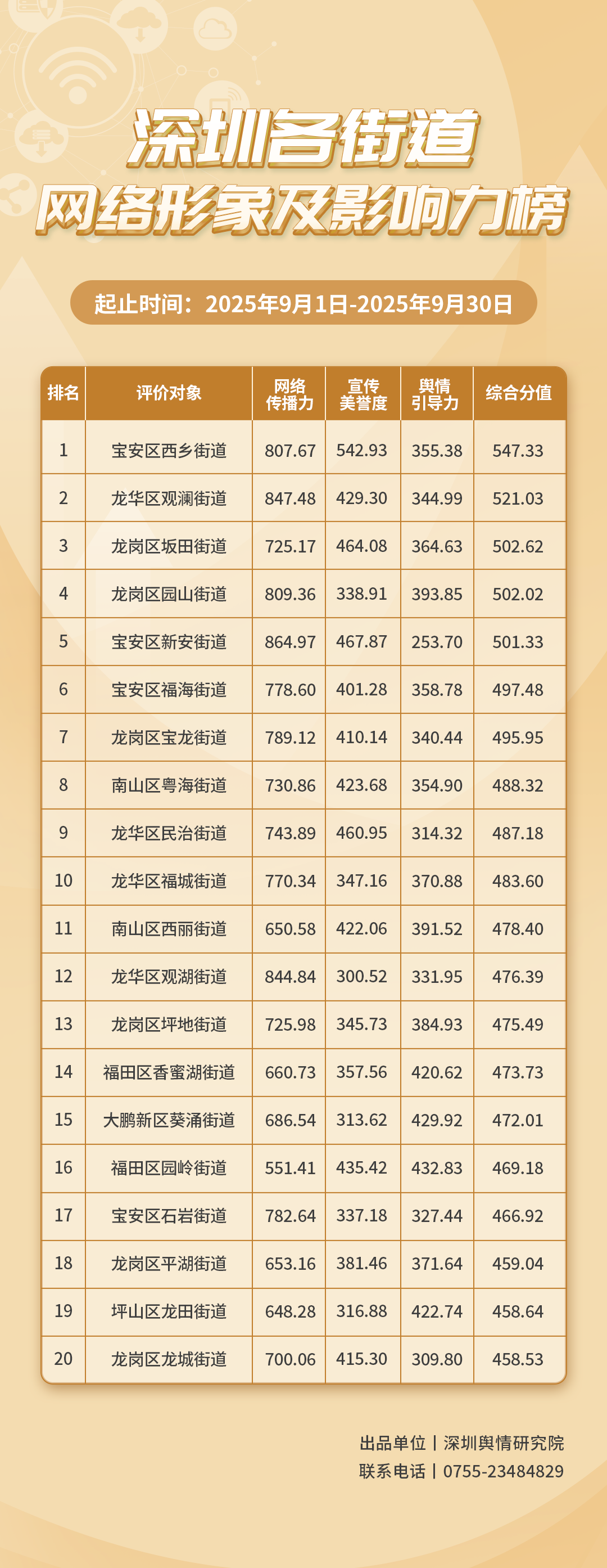 為深入了解深圳市各街道的網(wǎng)絡(luò)形象構(gòu)建狀況和社會影響,推動街道治理“提質(zhì)增效”,增強城市高質(zhì)量發(fā)展動能,深圳輿情研究院編制推出《深圳各街道網(wǎng)絡(luò)形象及影響力榜》。榜單具有獨立客觀的評價體系,通過數(shù)據(jù)采集和分析,評估各街道的網(wǎng)絡(luò)傳播力、宣傳美譽度及輿情引導(dǎo)力,并對全市11個區(qū)共78個街道的網(wǎng)絡(luò)形象及影響力進行綜合排名。