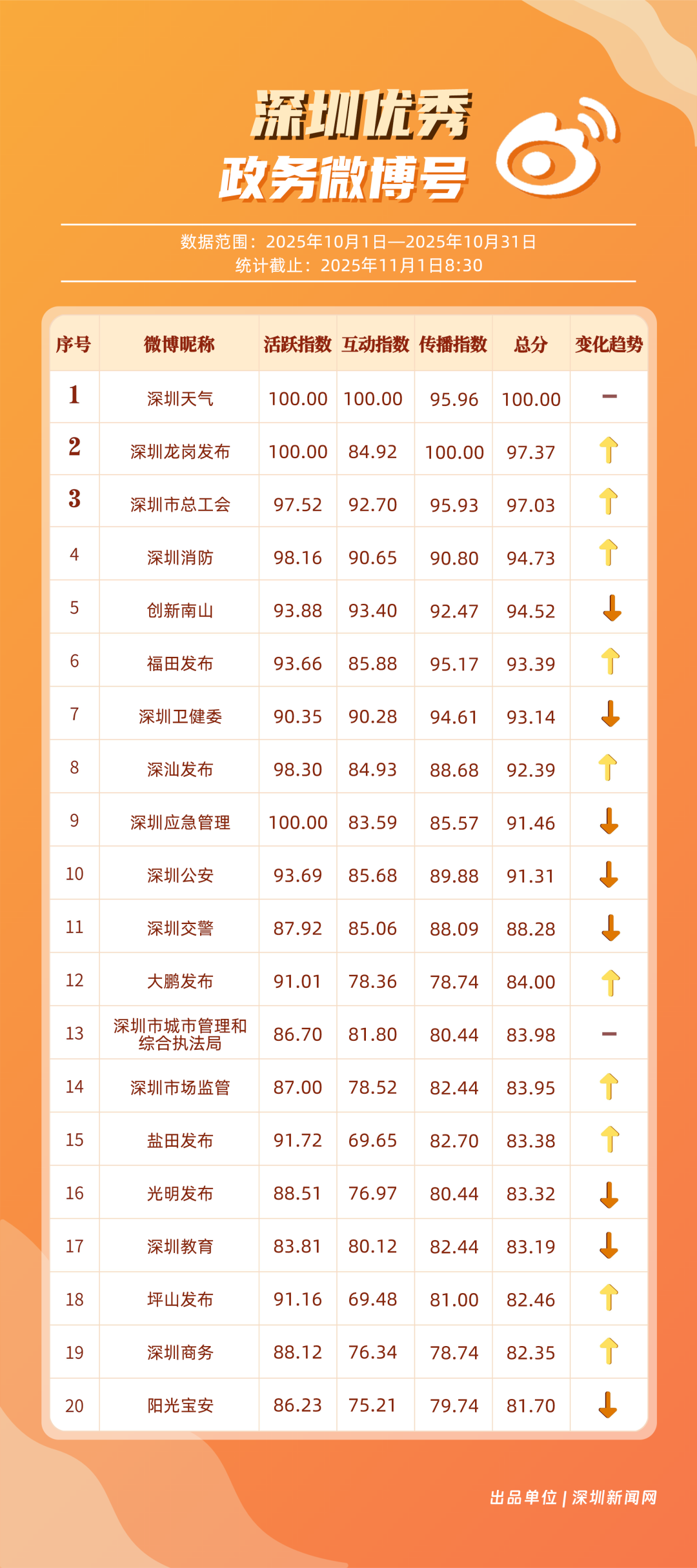 10月,20個賬號入選“優(yōu)秀政務微博號”榜單,其中包括:“深圳天氣”“深圳龍崗發(fā)布”“深圳市總工會”“深圳消防”“創(chuàng)新南山”“福田發(fā)布”“深圳衛(wèi)健委”“深汕發(fā)布”“深圳應急管理”“深圳公安”等。其中,“深圳天氣”高頻、及時地發(fā)布天氣相關內(nèi)容,其中多篇關于“冷空氣”“入秋”帖文收獲較好互動和傳播效果,以100分位列榜單首位;“深圳龍崗發(fā)布”總分97.37分,居于榜單第二,其有關演唱會定檔、卷尺哥等內(nèi)容的帖文獲得較好數(shù)據(jù);“深圳市總工會”關注職工日常生活,以97.03分居于榜單第三?!吧钲谙馈薄皠?chuàng)新南山”等微博賬號也通過各自的特色內(nèi)容,展現(xiàn)深圳城市治理、民生服務的溫度。